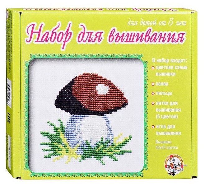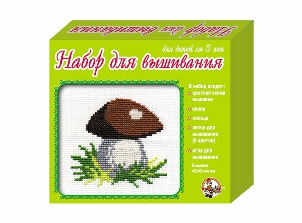 Грибок это тот набор с которого можно начать обучение вышиванию, но все таки не с 5 лет, а с 7-8. А так же набор можно смело покупать для уроков трудв. Нитки при вышивании из этого набора нужно использовать экономно. Остаются небольшие отрезки ( при правильном наложении стежков). Грибок вышить не сложно, начиная со шляпки, постепенно переходя на ножку и траву. Готовая работа отлично подойдет для изготовления игольницы, т.к. в грибок втыкать иголки не жалко.
