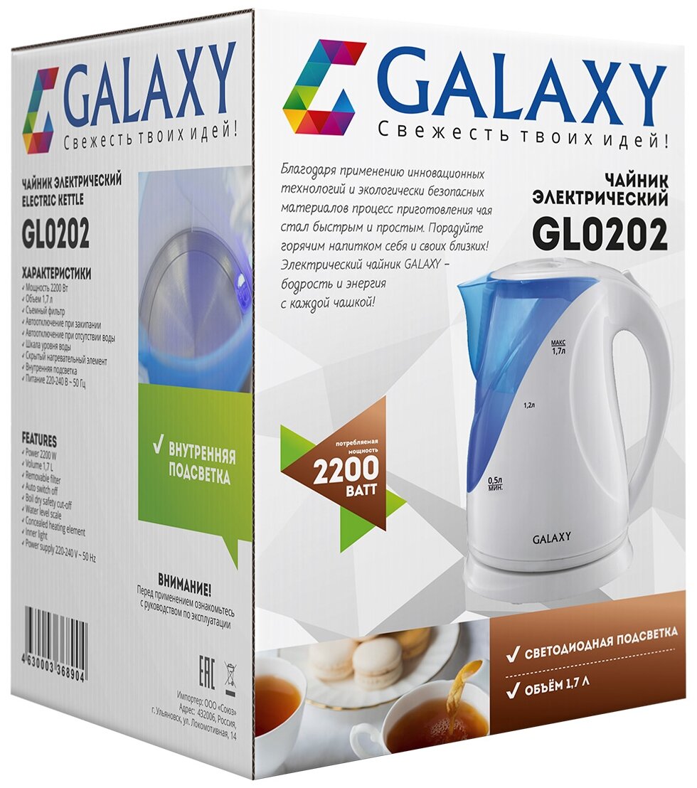 Удобный и простой в использовании чайник Galaxy изготовлен из термостойкого пластика. Благодаря мощности в 2200 Вт и нагревательному элементу скрытого типа, быстро вскипятит воду объемом до 1,7 литров. Подсветка резервуара создаст неповторимую атмосферу во время работы прибора. На рынке бытовой техники этот чайник пользуется неизменной популярностью благодаря высокому качеству, безопасности и удобству в использовании.