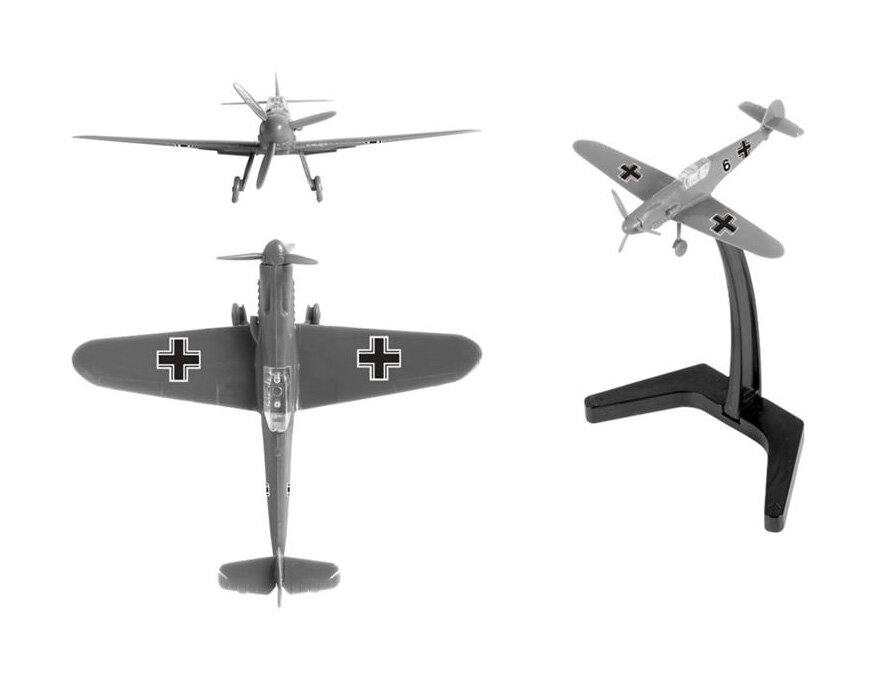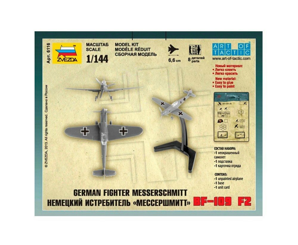 В этом наборе от компании «Звезда» моделистам и коллекционерам масштабных моделей предлагается собрать из имеющихся деталей миниатюрную копию знаменитого немецкого истребителя «Мессершмитт», который получил широкую известность во время Второй мировой войны и был основным противником Советского Союза в небе.В комплекте, помимо элементов и инструкции, присутствует карточка отряда, которая пригодится во время игры в Art of Tactic, а также подставка для готовой модели. Благодаря ей можно будет установить самолет на полке, украсив таким образом интерьер комнаты. Стоит обратить внимание на то, что сборка модели осуществляется без использования клея.
