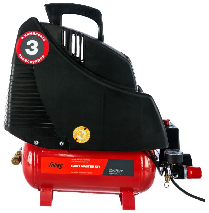 FUBAG – поршневой компрессор с набором пневматических инструментов. Мощность – 1100 Вт, производительность – 180 л/мин. Предназначен для использования в гараже или частной мастерской. Подойдёт для продувки, накачки шин, матрасов, резиновых игрушек, покрасочных работ и т.д.
