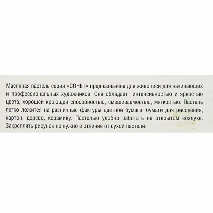 Масляная пастель серии "СОНЕТ" предназначена для живописи для начинающих и профессиональных художников. Она обладает интенсивностью и яркостью цвета, хорошей кроющей способностью, смешиваемостью, мягкостью. Пастель легко ложится на различные фактуры цветной бумаги, бумаги для рисования, картон, дерево, керамику. Пастелью удобно работать на открытом воздухе. Закреплять рисунок не нужно в отличие от сухой пастели.