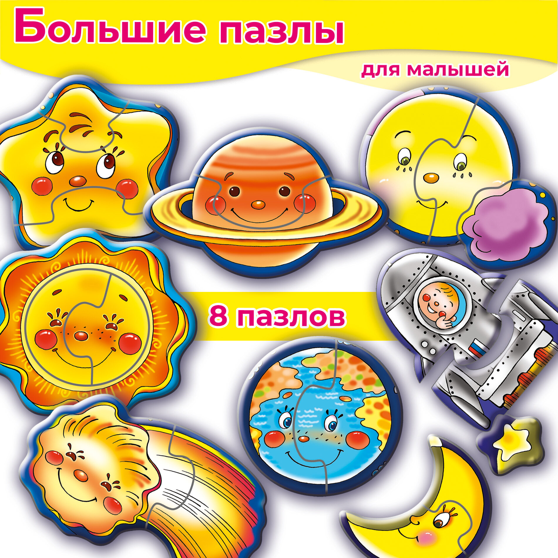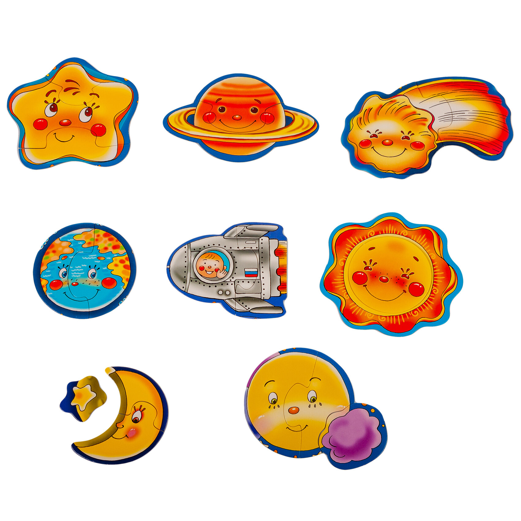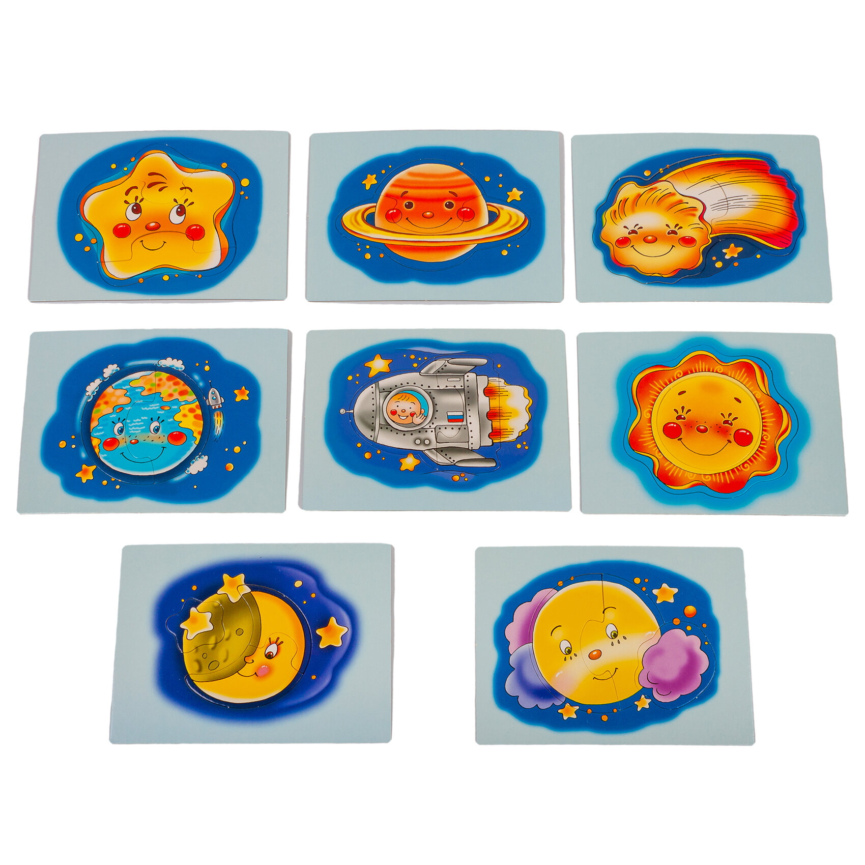 В наборе 8 рамок для картинок, 8 картинок: Земля, Солнце, звезда, метеор, планета с "кольцом" (не знаю, какая из), ракета, месяц и полная луна. Картинки состоят из 2 или 3 составных частей. Рамки можно использовать, а можно собирать картинки и без них.