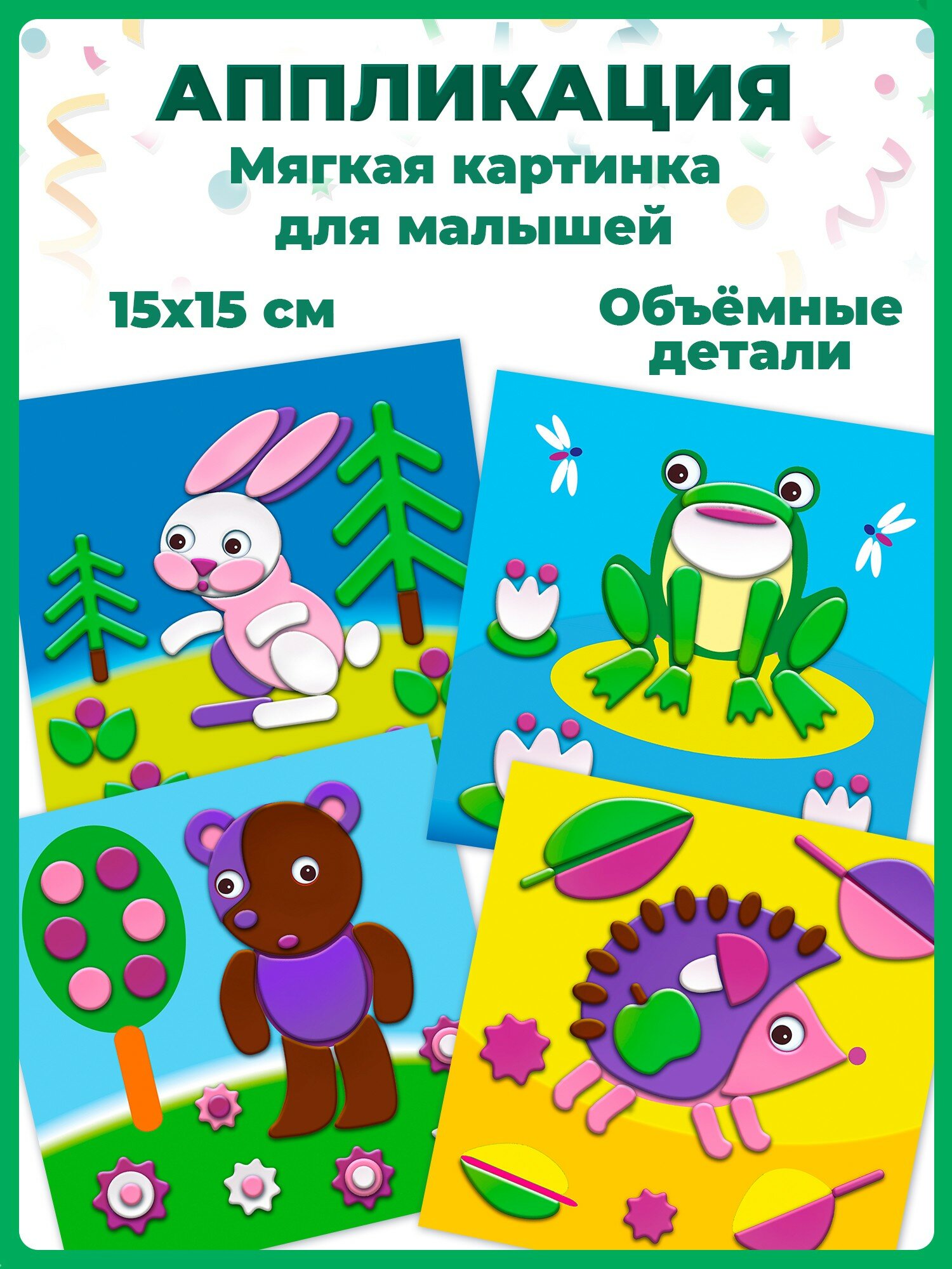 Отличная серия для малышей. Двухлетней дочке аппликации очень понравились. На одном дыхании собрала сразу несколько картинок. Материал удобный. Фигуры в большинстве своем крупные. Легко отклеиваются. Если не ровно приклеил - без труда можно поправить. Получаются яркие и интересные картинки. Да еще и цена очень доступная. Обычно за такие деньги можно приобрести только одну картинку, но не четыре)) Заказала и другие наборы из этой серии