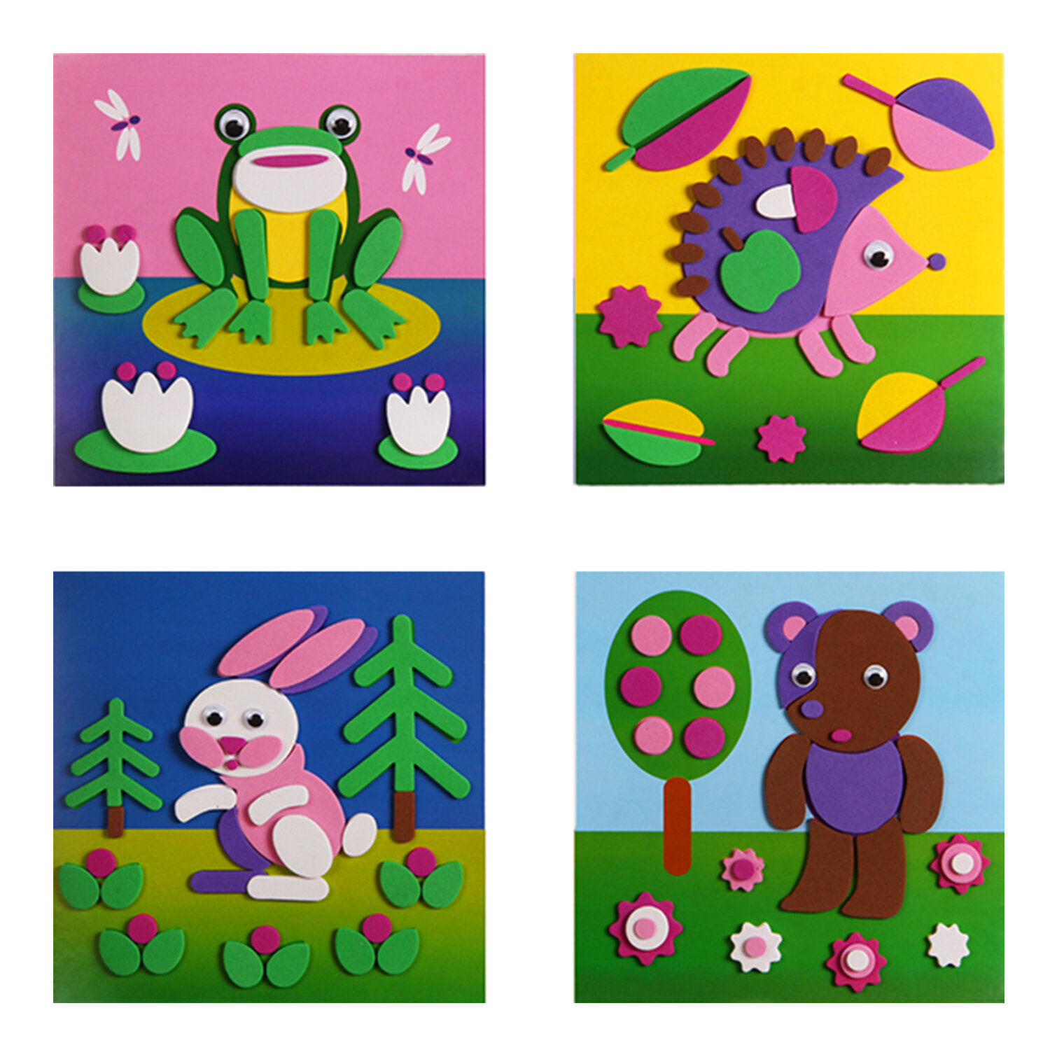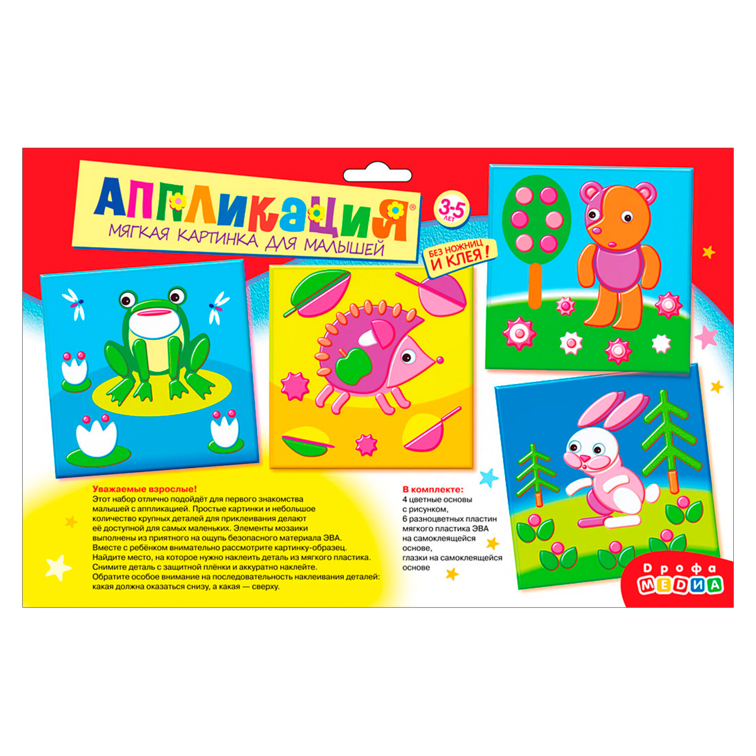 Этот набор отлично подойдёт для первого знакомства малышей с аппликацией. Простые картинки и небольшое количество крупных деталей для приклеивания делают её доступной для самых маленьких. Элементы мозаики выполнены из приятного на ощупь безопасного материала ЭВА.