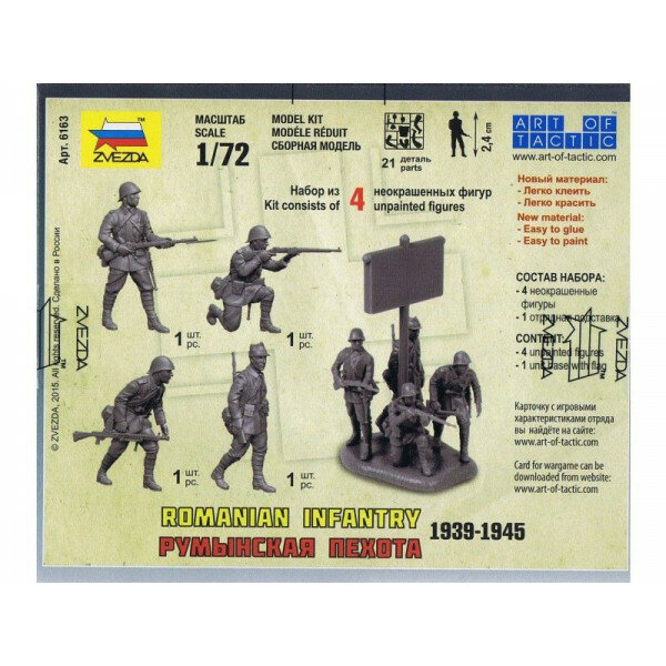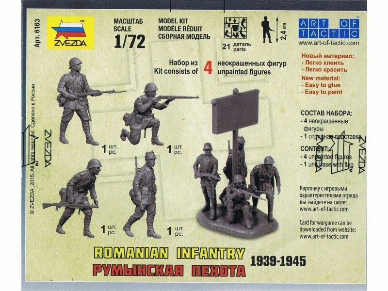 Королевство Румыния вступила в войну против СССР 22 июня 1941 года. В планах румынских властей был захват и присоединение к Румынии современной Молдавии и Одесской области с прилегающими землями. Для этих целей было выставлено довольно большое количество войск. В основном это была большая масса пехоты и кавалерии, слабо вооружённые, с плохим оснащением несовременной бронетехникой. Румынская армия уже в начале войны понесла значительные потери. Так, 24 июня советские пограничники сбросили в Дунай румынские части, закрепившиеся там 22 июня. В ходе наступления на Одессу, румынские войска имели огромное превосходство в силах и средствах над советскими войсками, однако, потеряв больше 90 тысяч человек, смогли взять город лишь после того, когда последний транспорт с последними защитниками Одессы скрылся на горизонте. Сталинград, Яссы, Кишинёв, Крым все эти названия до сих пор отзываются грозным эхом в памяти румынской армии - это места, где румынская армия понесла огромные потери и была уничтожена наступающими частями советской армии. Использование мини-набора в Art of Tactic: В игре румыны представляют из себя слабейшее подразделение в игре, набирающееся на сдачу . Низкая мораль, малая дальность огня это только часть перечисленных минусов этого отряда.