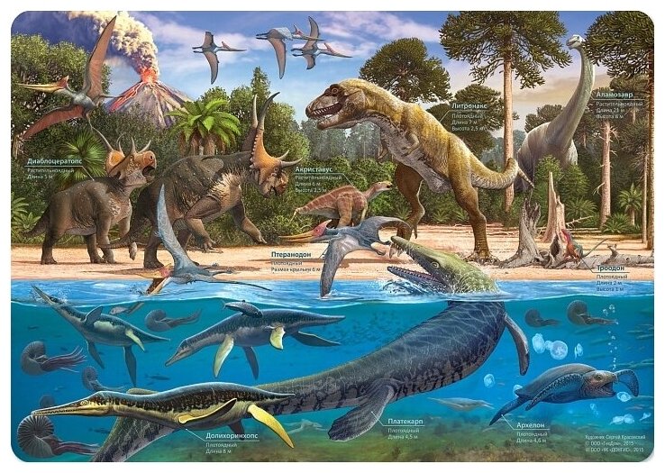 Представлены и летающие, и сухопутные, и водоплавающие динозавры. Ребенок оценил, что есть подписи и краткие сведения о каждом динозавре, и он может узнать новые виды. Да и я свои знания существенно пополнила) -