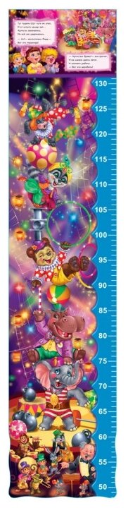 Классная книга в плотном глянцевом исполнении, необыная и интересная задумка. Всего в книге 12 четверостиший, много разворотов, ростомер от 50 до 130 см. Когда раскрываешь книгу - с одной стороны цирковой цельный рисунок получается, с другой - нарисованные "артисты" и стихотворения. Правда, ребенку было бы удобнее, если бы книга раскрывалась не снизу вверх, а справа налево.