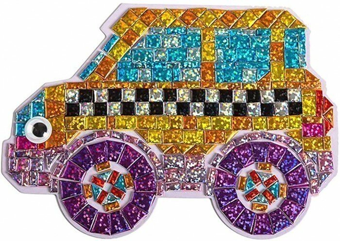 Неделю назад приобрели данную аппликацию. Ребенок 4 лет самостоятельно сделал за 2 дня (работа достаточно кропотливая: нужно наклеить маленькие квадратики-треугольники разных цветов). Удобно, что цвета пронумерованы как на клеящей основе так и не картоне. Готовую машинку повесили на холодильник (в комплекте еще 4 магнита, которые приклеиваются на обратную сторону машинки) - смотрится очень красиво! Ребенок доволен! Рекомендую!