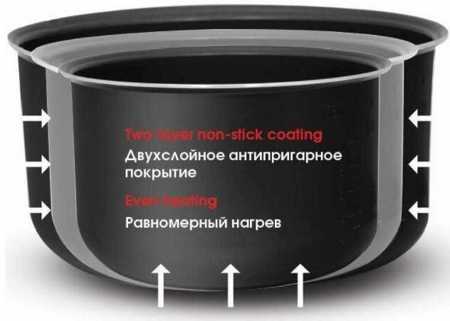 | Прочие особености и свойства | Чаша для мультиварки изготовлена из высококачественного алюминиевого сплава. Высококачественное антипригарное покрытие позволяет готовить с использованием минимального количества масла и жиров, сохраняя естественный вкус продуктов. |