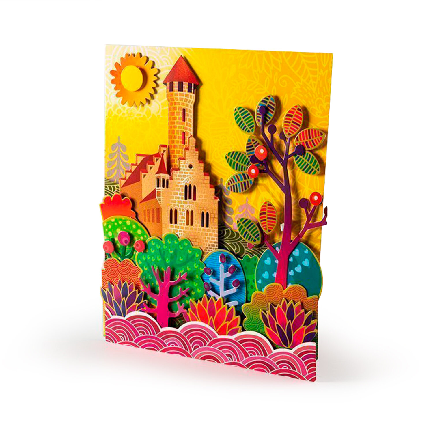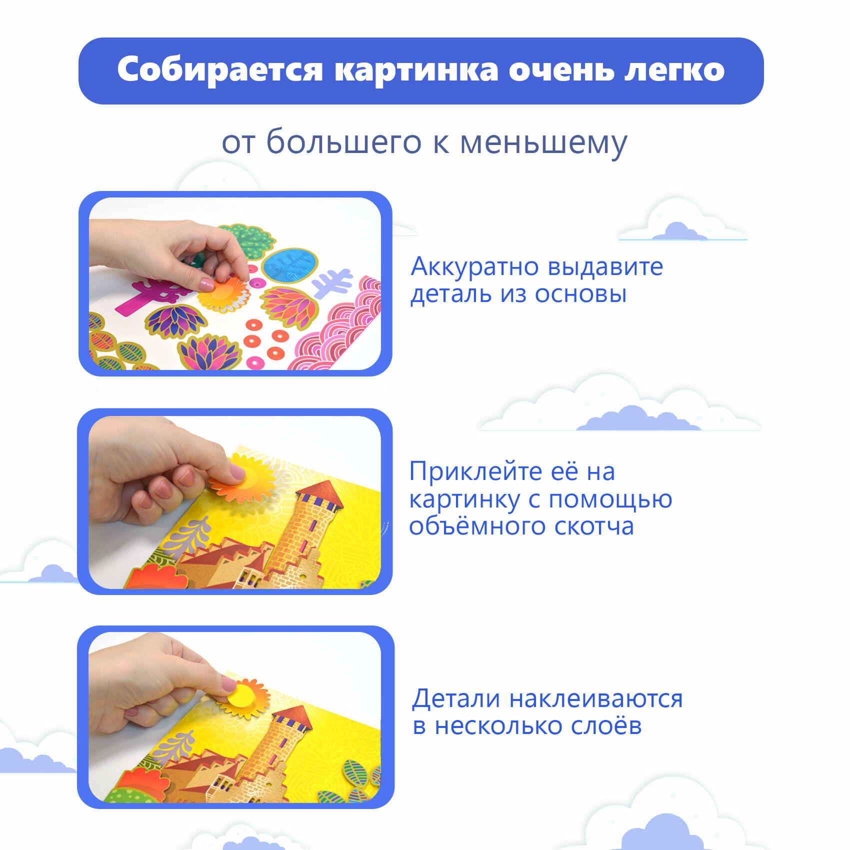 3D-аппликация — современный и очень увлекательный вид творчества. Данный набор позволит создать необыкновенно выразительную 3D-картину. Яркие и красочные детали изображения, выполненные из плотного картона, выступают над основой, создавая причудливый и сказочный мир. Этот удивительный 3D-эффект возникает благодаря использованию объёмного двустороннего скотча. Готовое изделие смотрится необыкновенно эффектно.