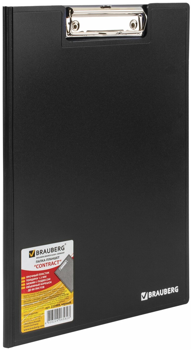 Папка-планшет BRAUBERG "Contract" используется для работы со счетами, накладными и другими документами. Незаменима при работе на складе, в магазине, при участии в конференциях, выставках и других публичных выступлениях. Папка-планшет формата А4 с верхним прижимом и крышкой фиксирует до 90 листов. Изготовлена из жесткого полипропилена толщиной 1,5 мм, что позволяет комфортно делать записи на весу. Металлический прижим обеспечивает плотное прилегание документов, выдвижной подвес позволяет разместить папку на вертикальной поверхности, а верхняя крышка надежно защищает ваши документы от пыли, влаги и других негативных факторов внешней среды.