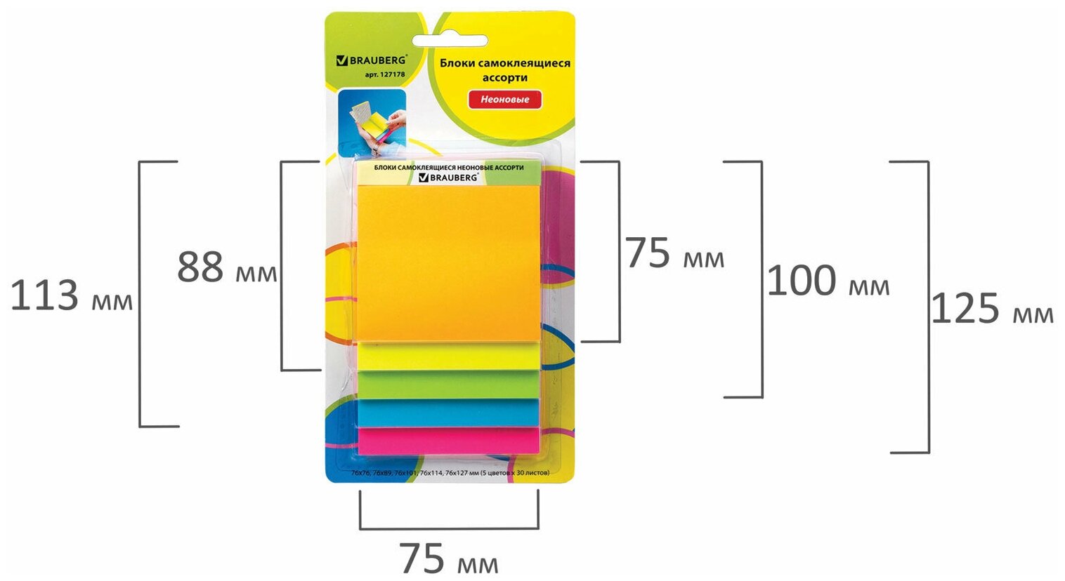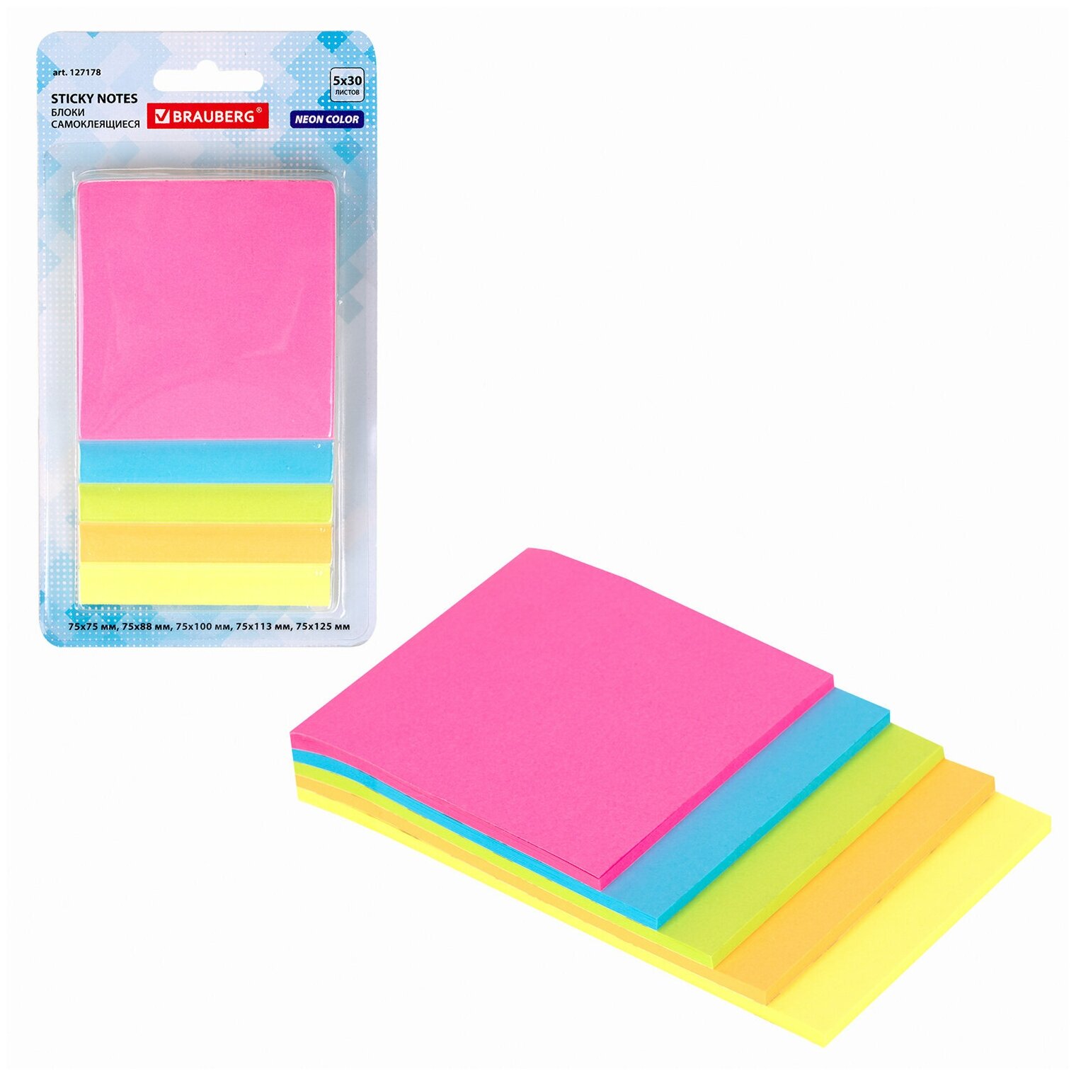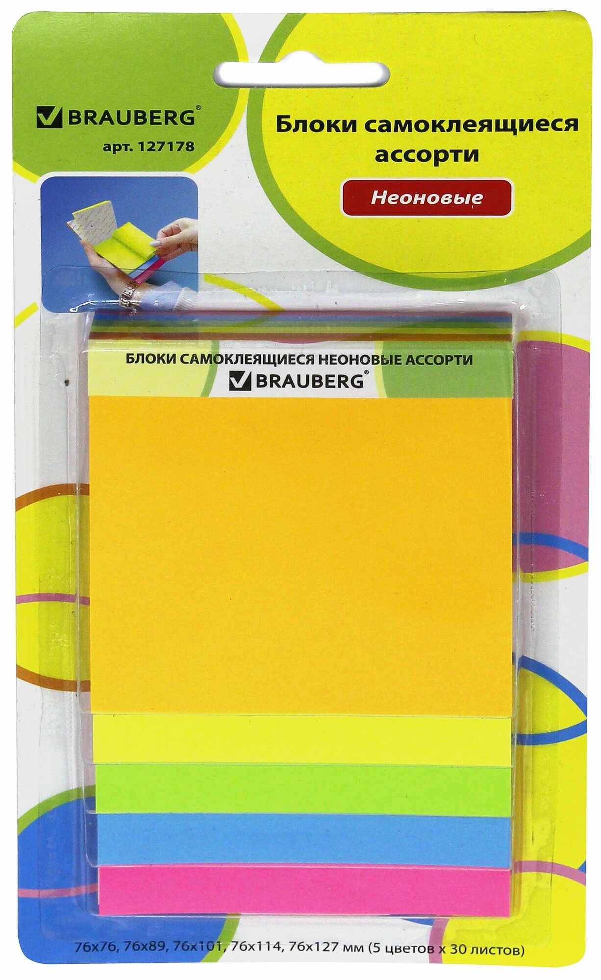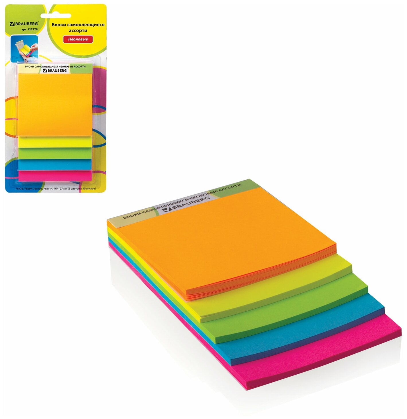 Блоки самоклеящиеся "Неоновые" (ассорти 5 цветов по 30 листов) (127178); Brauberg, 2016