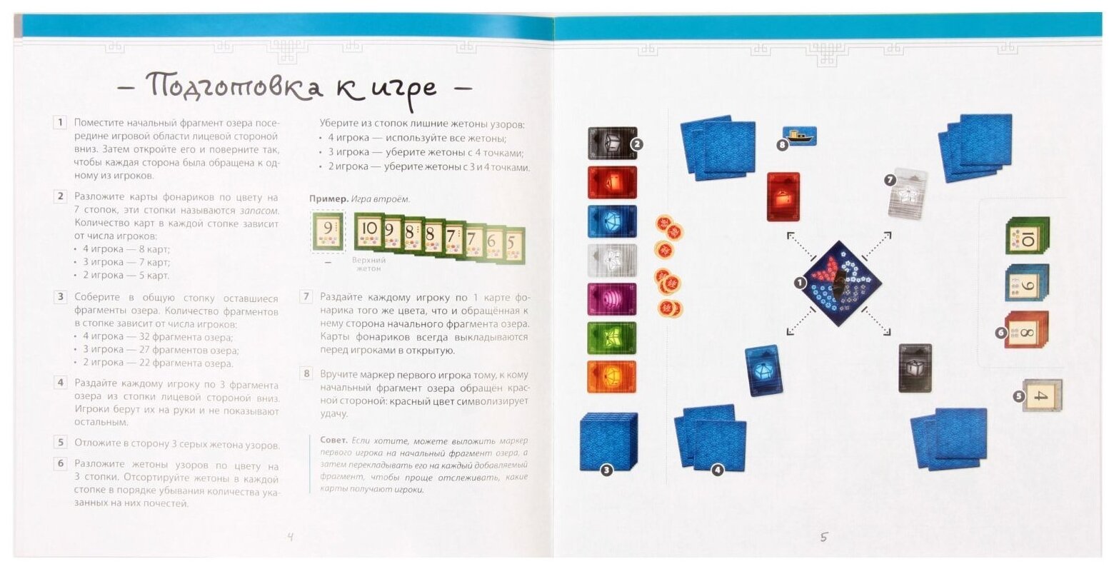 | Комплектация | маркер первого игрока, 56 карт фонариков, 30 жетонов узоров, 36 фрагментов озера, 20 жетонов поощрений, правила |