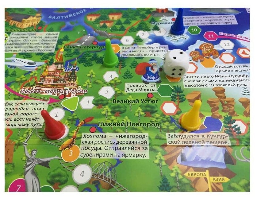 Игровое поле на основе карты России адаптировано для детей художниками и редакторами Издательства. Бросайте кубик, чтобы определить, по какому маршруту следовать: по Транссибирской магистрали или по Северному морскому пути. В ходе игры произойдет знакомство даже с самыми отдаленными уголками Родины от ее западных границ до восточных.