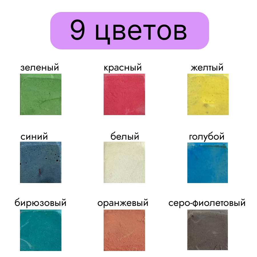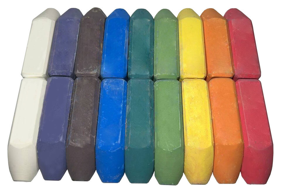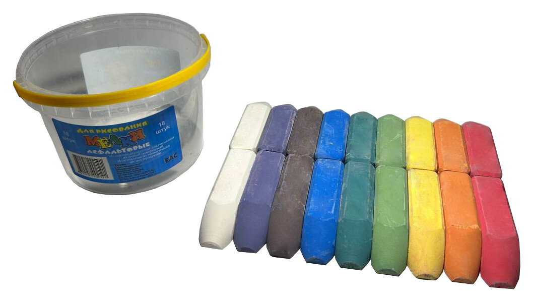 Из 18 мелков 10 оказались белыми (посмотрите, сколько стоит купить отдельно белый мел - намного дешевле!), остальные - жёлтый, розовый, оранжевый, голубой, зелёный и сиреневый, тёмно-синий и бирюзовый, все достаточно пастельные (кроме розового). Банка хрупкая, пришла совершенно разбитая. Своих денег не стоят совершенно.