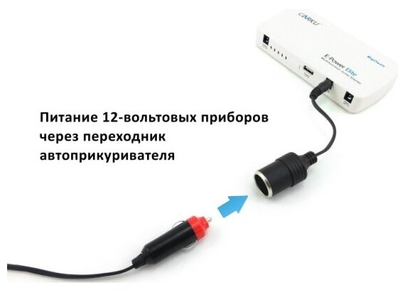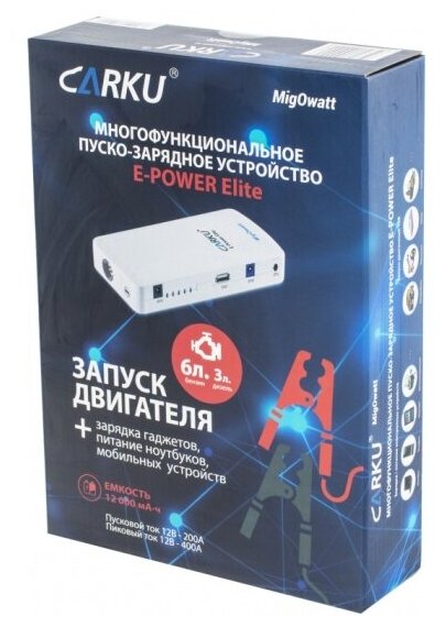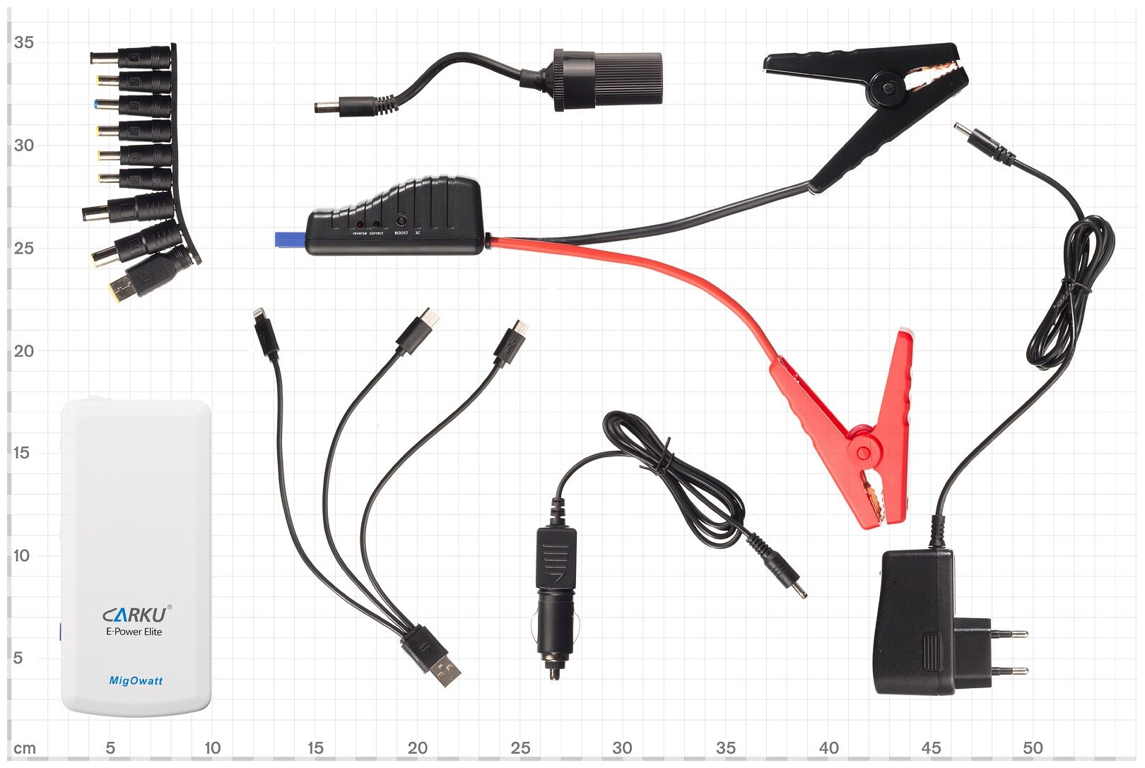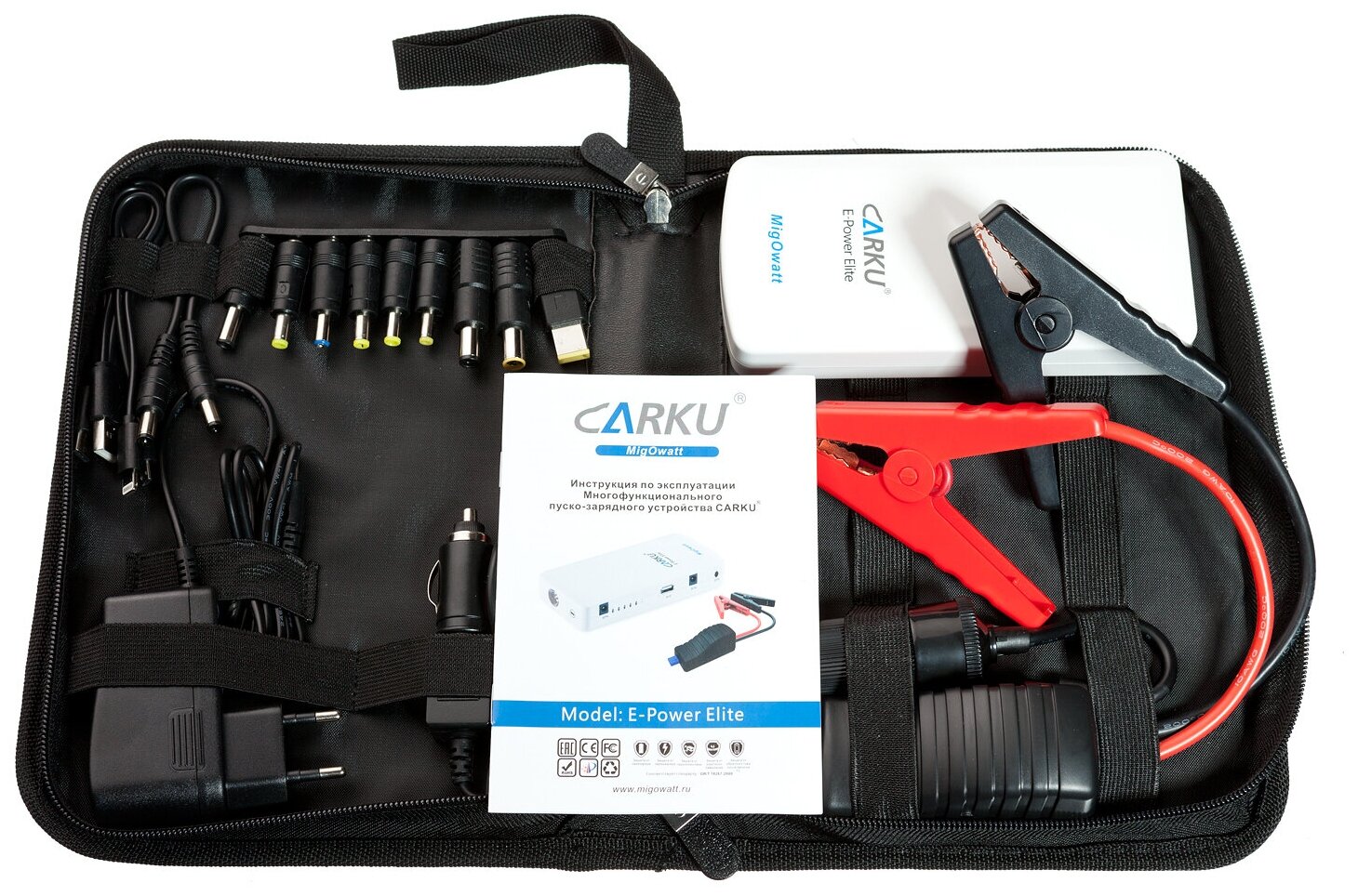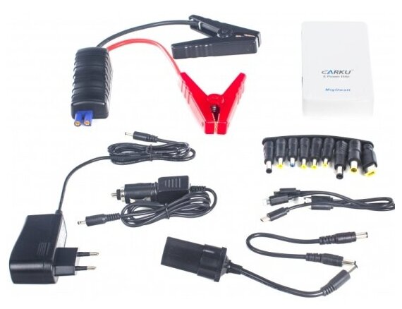 CARKU емкость — 44,4 Вт/ч обеспечивает бесперебойную работу переносных гаджетов: от телефона до ноутбука. И самое важное, он может завести Ваш автомобиль. Оставили включенными фары автомобиля? «Умер» аккумулятор? Зима на дворе? CARKU-E-Power спасет Вас в такой ситуации. Вы без проблем сможете завести двигатель автомобиля. В набор CARKU входят кабельки под все типы и модели переносных гаджетов.