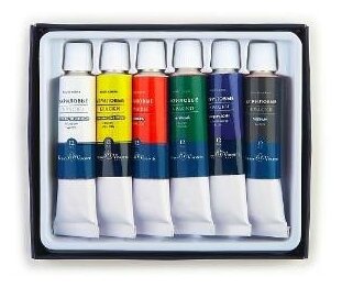 В наборе 6 цветов: киноварь, лимонно-желтый, зеленый, ультрамарин, белила титановые, черный.