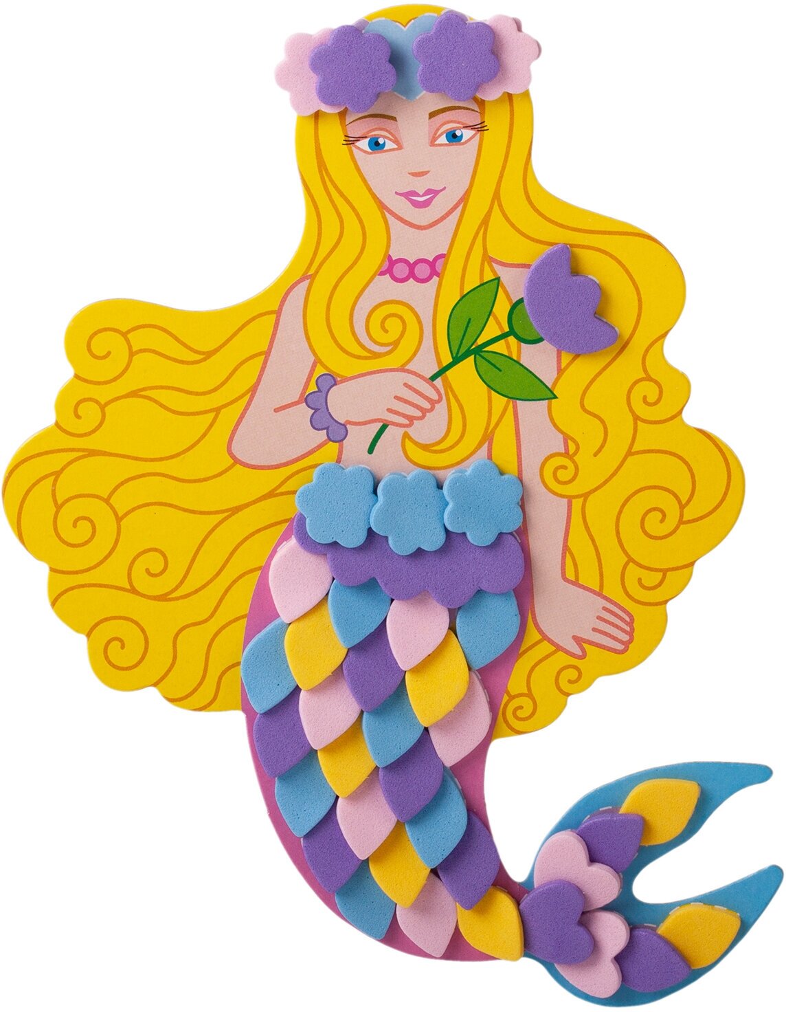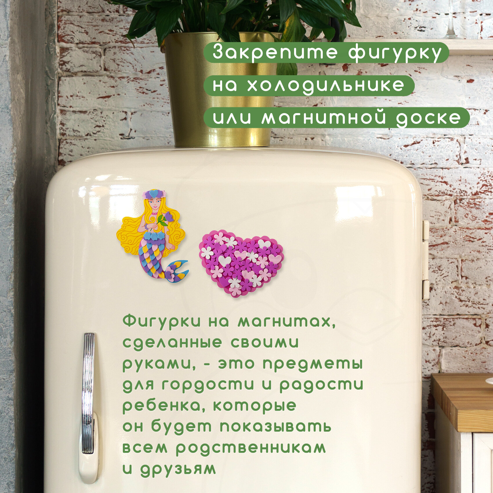 Можно ли плоскую картинку сделать объёмной? С помощью наборов для творчества из серии "Аппликация. Игрушки на магнитах" это возможно! Если внимательно следовать инструкции, то русалка и сердечко обретут интересный и необычный рельеф. Подобный эффект достигается благодаря оригинальной технике наклеивания деталей: если при наклеивании одна деталь будет немного находить на другую, то получится эффект "чешуек".