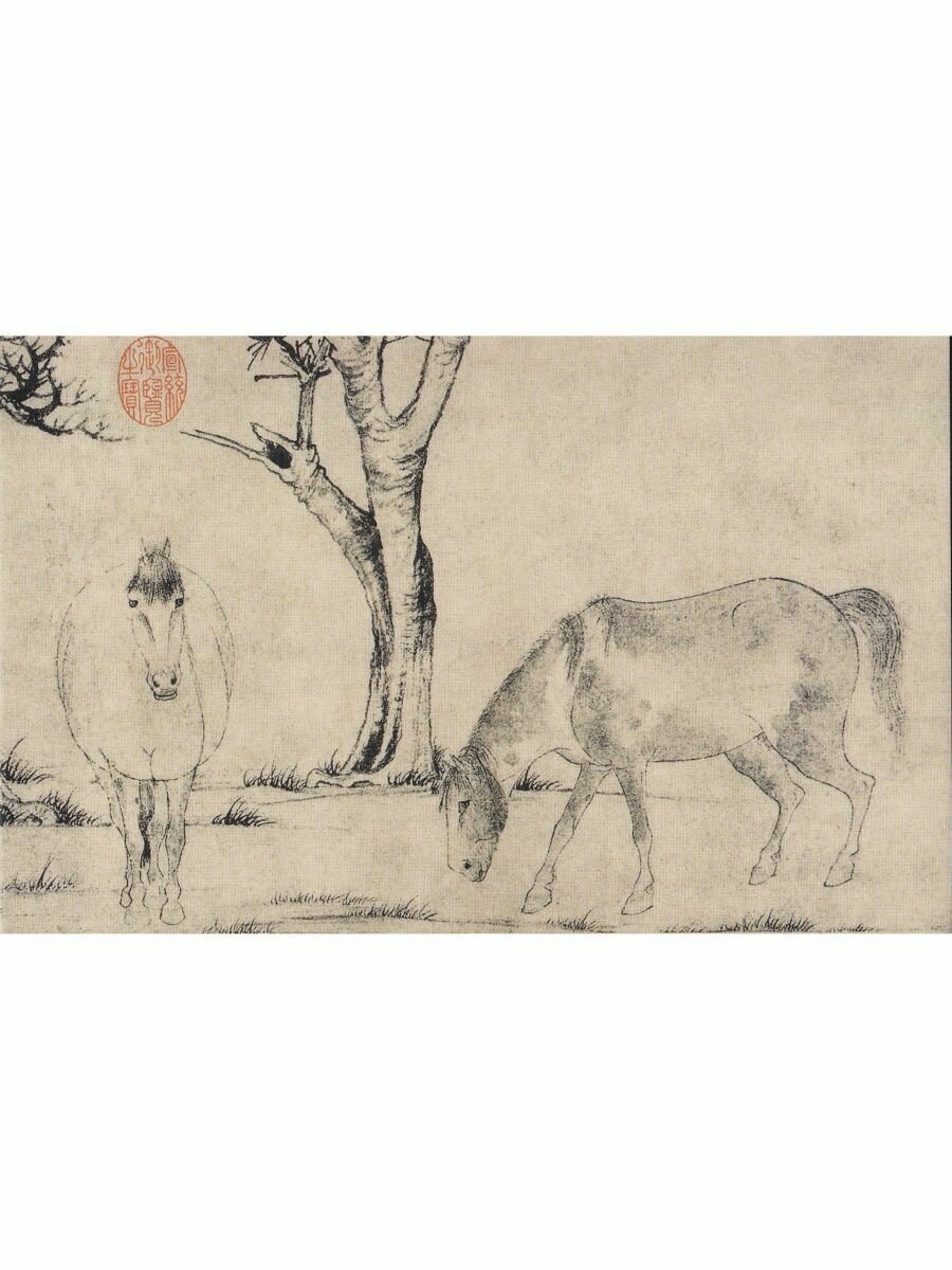 Чжао Мэнфу "Старое дерево и два коня" (фрагмент), "Удод на ветке бамбука", "Старое дерево, бамбук и камень" (фрагмент), "Осенние краски вокруг гор Цяо и Хуа" (фрагмент).