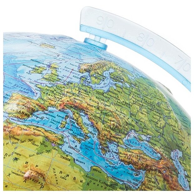 На глобусе указаны континенты, острова, горы, реки, крупные города и многое другое.