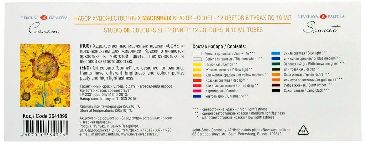 Краски художественные масляные 12 цветов "Сонет" (2641099); Невская палитра, 2017