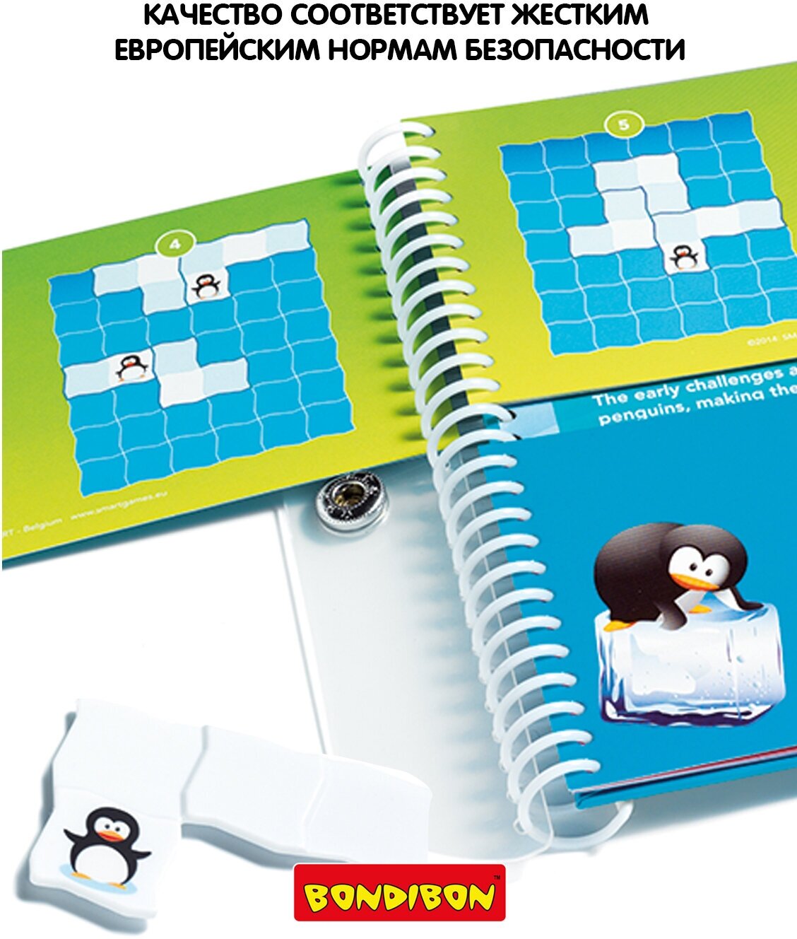В состав игры входят шесть магнитных деталей-пингвинов и игровое поле с красочным буклетом.