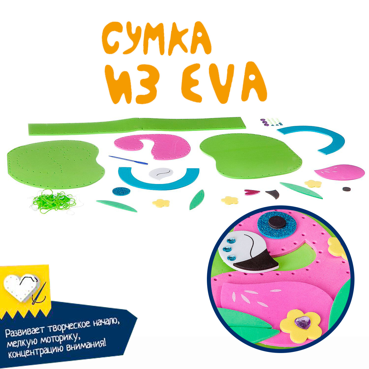 Чудесный набор по созданию сумки из ЕVA - прочного, легкого материала. Все необходимое - для создания и украшения сумочки мечты - в наборе Набор абсолютно безопасен - в составе пластиковая игла и перфорированные самоклеящиеся детали.