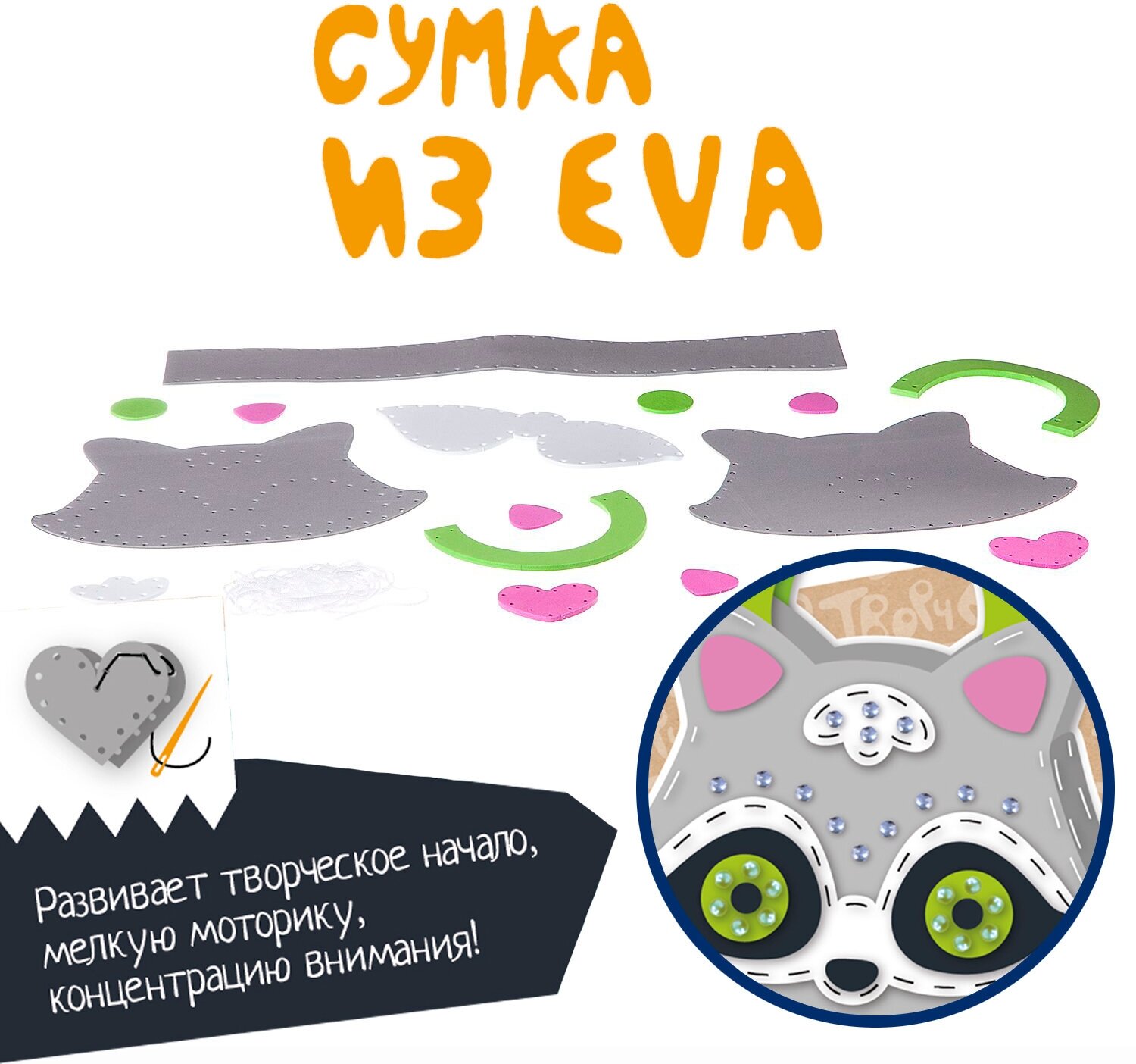 Чудесный набор по созданию сумки из ЕVA - прочного, легкого материала. Все необходимое - для создания и украшения сумочки мечты - в наборе Набор абсолютно безопасен - в составе пластиковая игла и перфорированные самоклеящиеся детали.