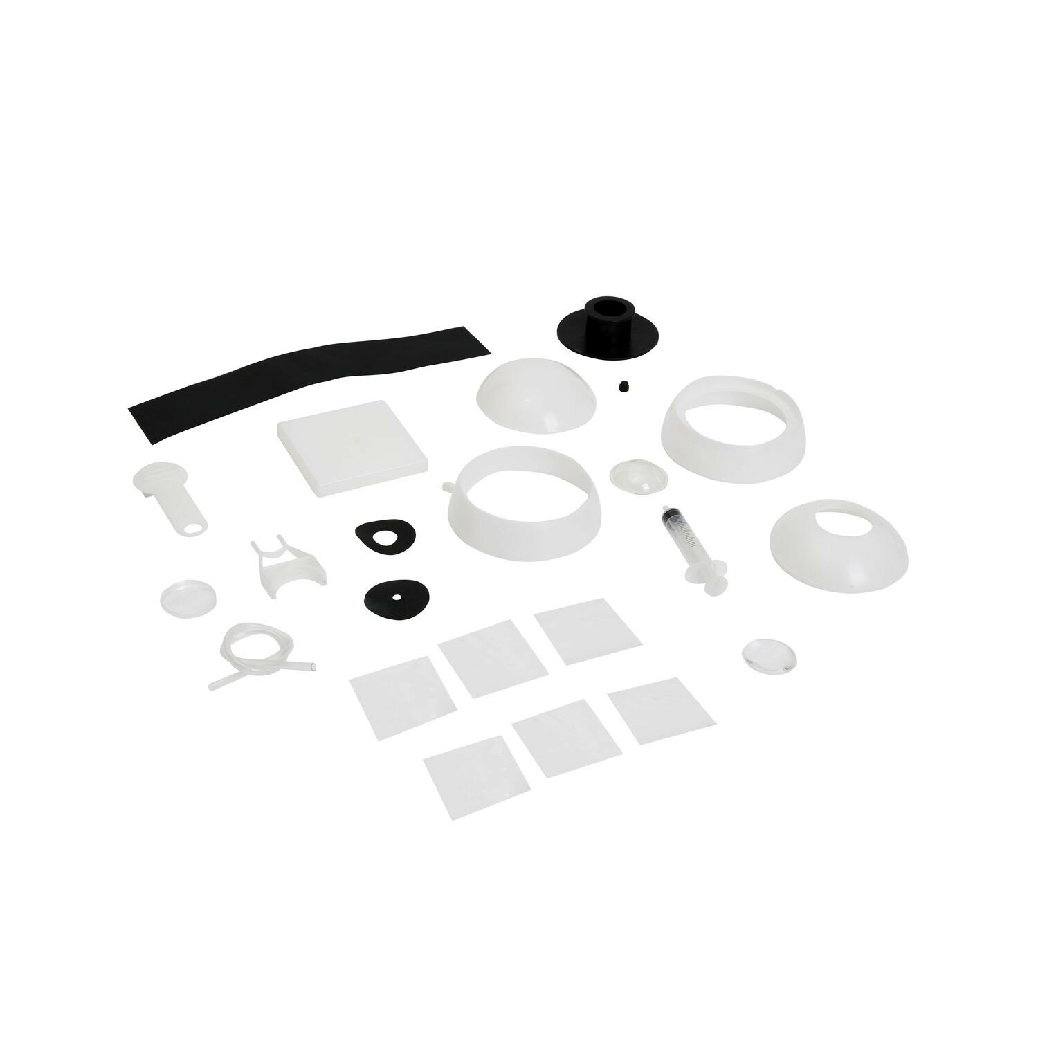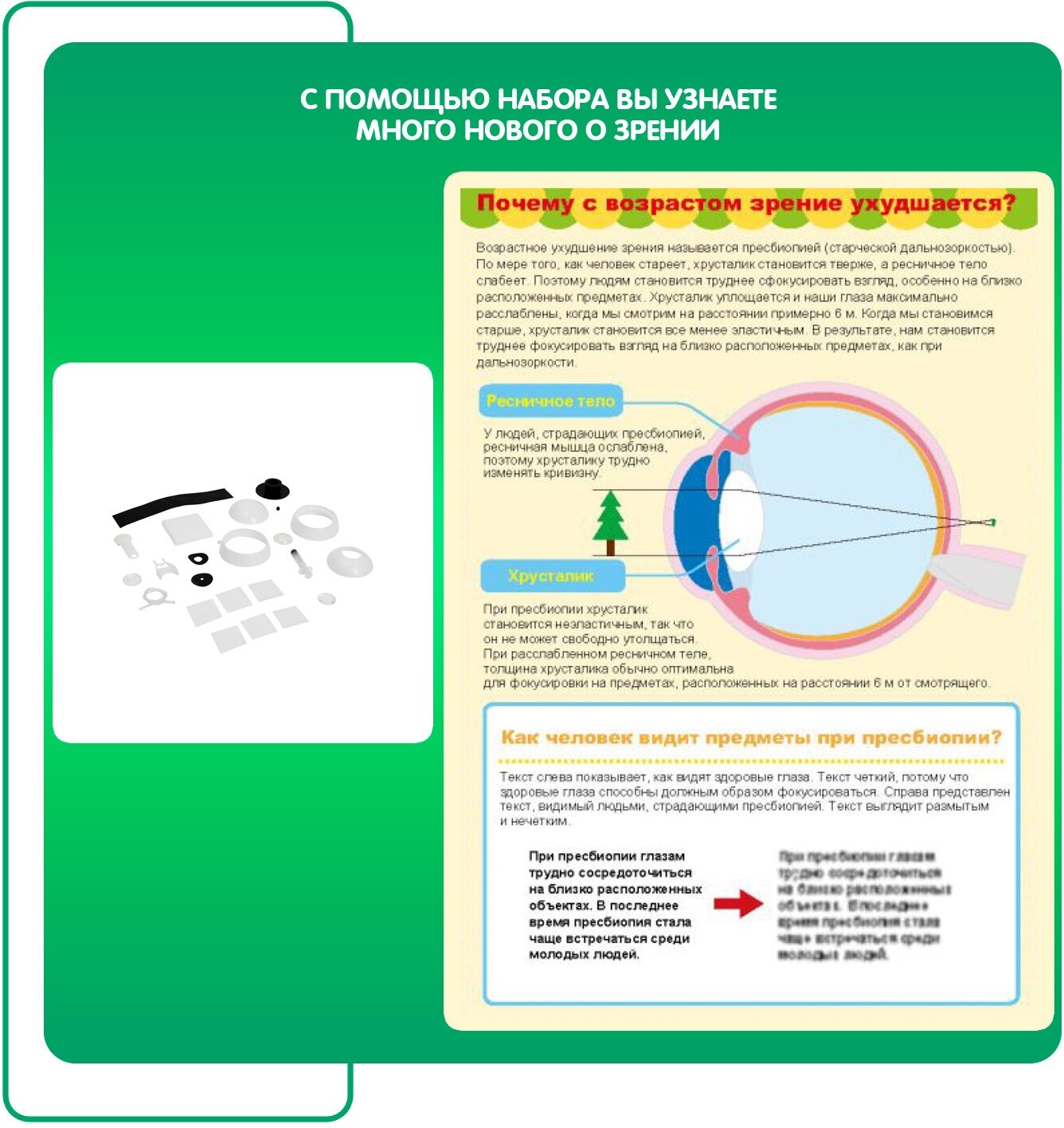В состав набора входят 4 основные детали, основание, кольцо для линзы большое, цилиндр линзы, заглушка, кольцо для линзы маленькое, выпуклая линза, вогнутая линза, крепление для линзы, держатель для линзы, роговая оболочка, 2 радужных оболочки, гибкая трубка, шприц, черная бумага, полиуретановая пленка, красочная инструкция.