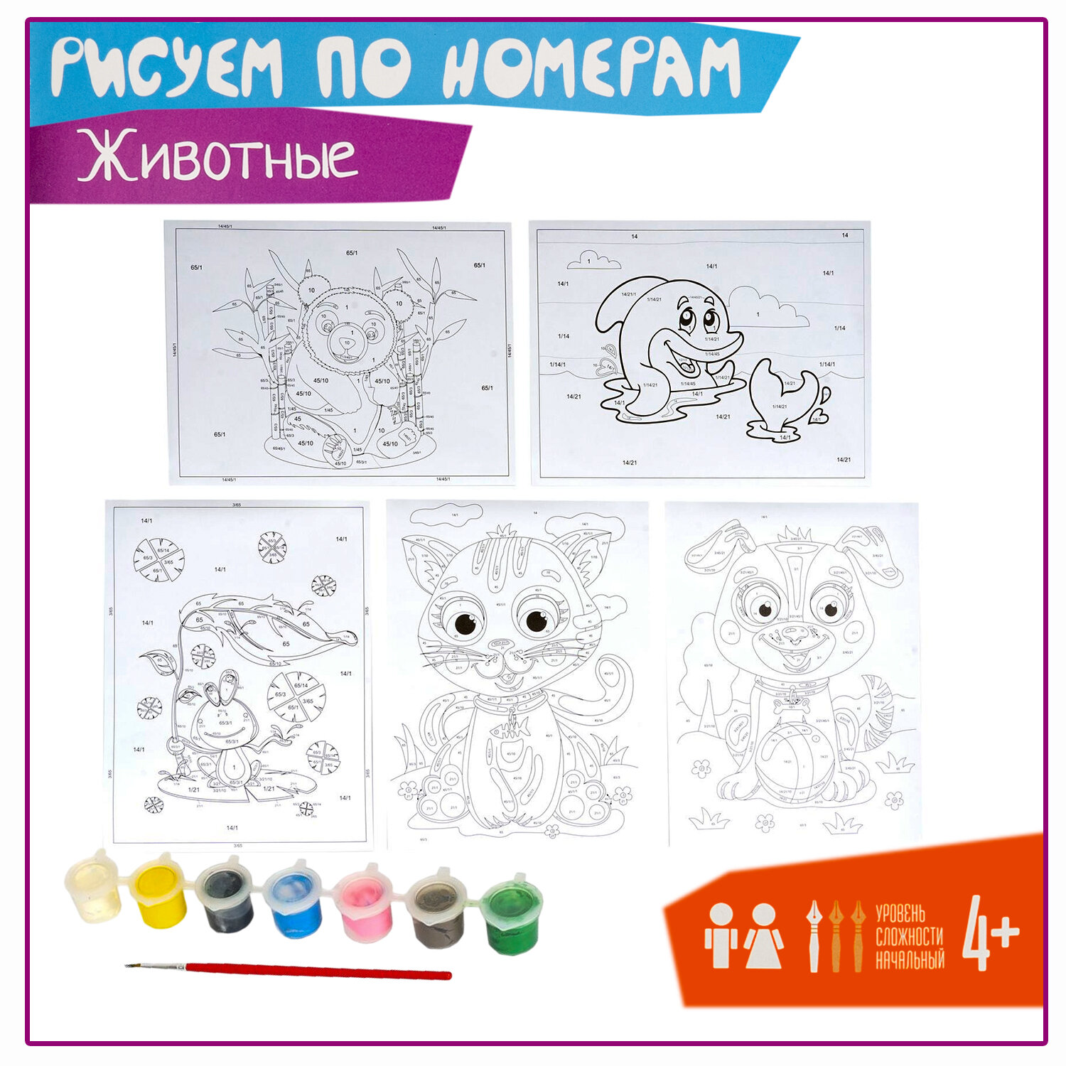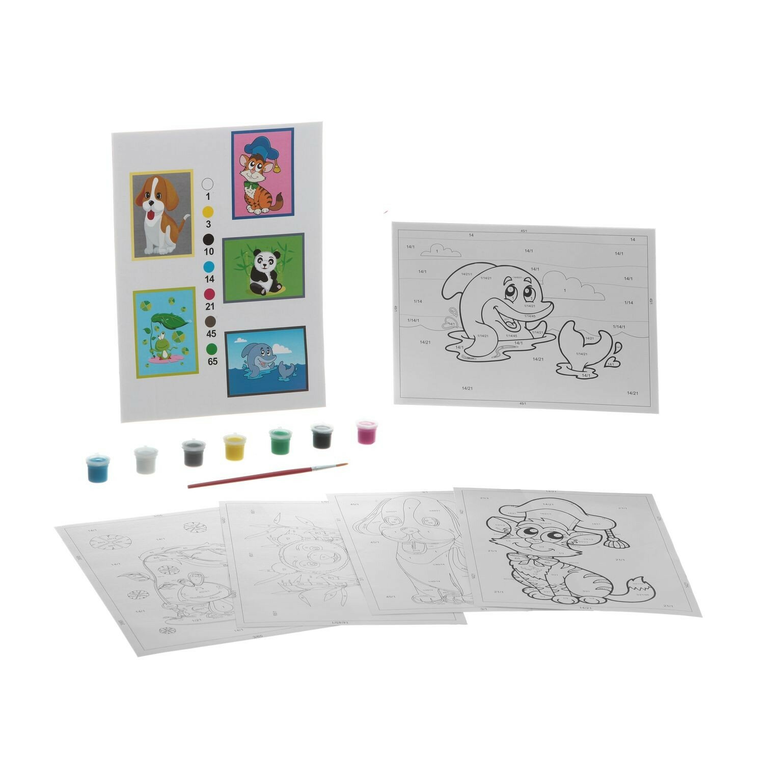 Комплектность: акриловые краски (7 штук), 5 листов для раскрасок, образцы (5 картин), кисть.