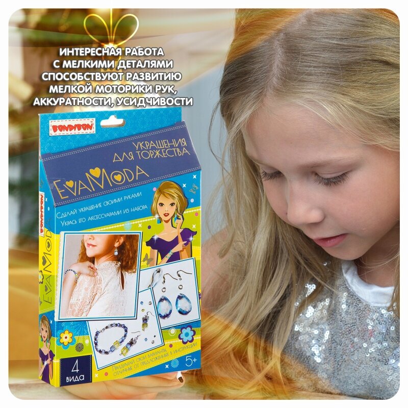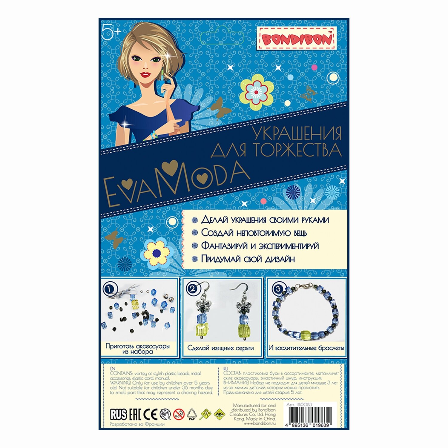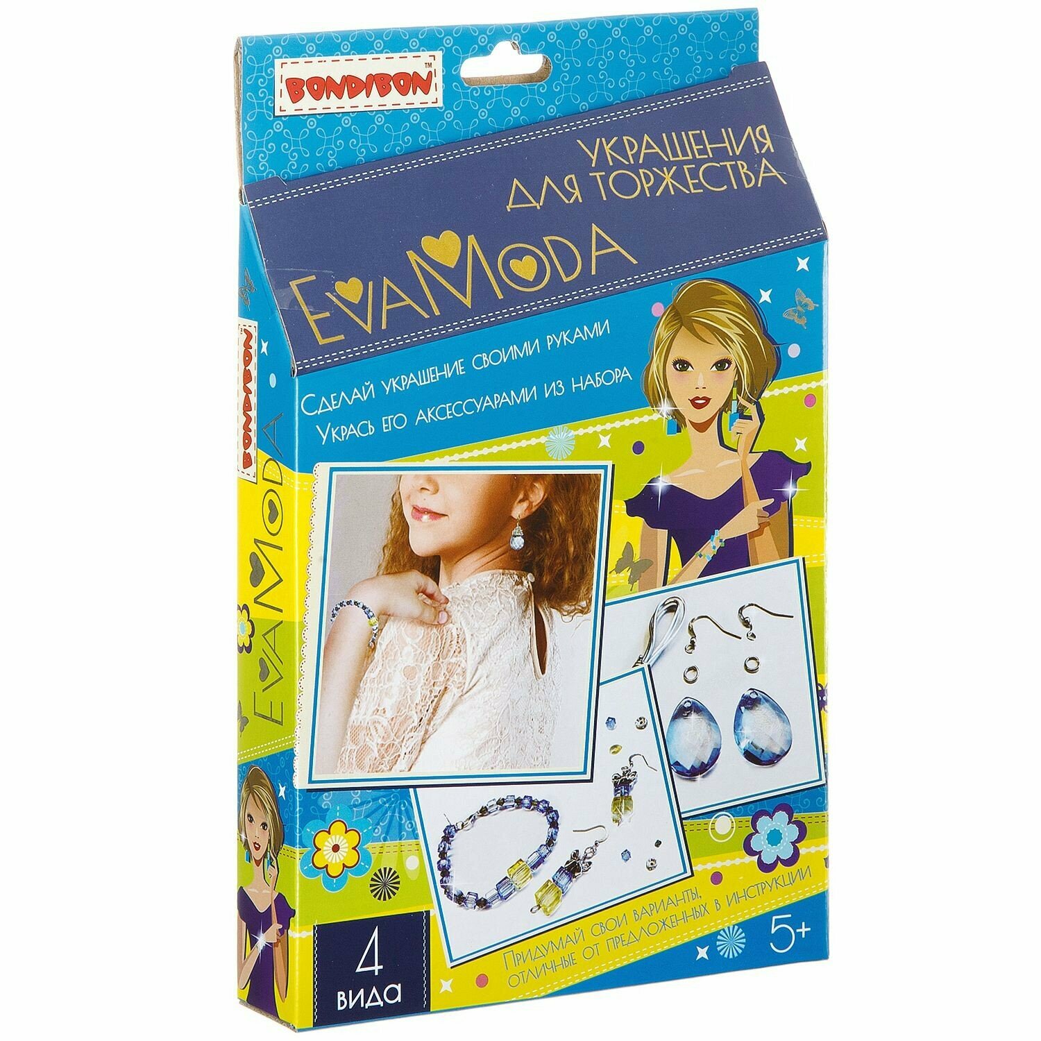 Набор для создания украшения Eva Moda входит в серию наборов для творчества "Украшения для торжества" от компании Bondibon. С его помощью девочка сможет самостоятельно создать потрясающе красивые украшения, которые затем смело можно будет надеть на вечеринку или торжественное мероприятие. Готовые сверкающие украшения выглядят нежно и изящно, они способны придать образу элегантности даже в сочетании с вполне заурядным платьем. Девочка может создавать украшения по инструкции или же проявить фантазию и сделать что-то свое, оригинальное и необычное.