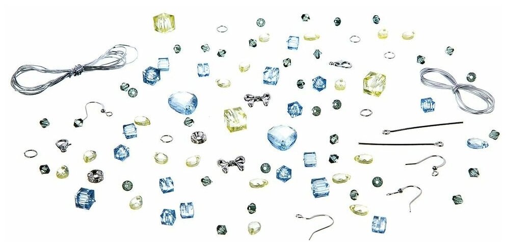 Комплект: пластиковые бусы в ассортименте, металлические аксессуары, эластичный шнур, инструкция.