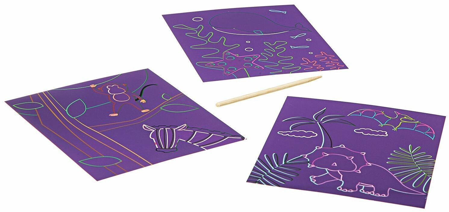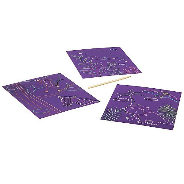 В наборе три гравюры на тему: динозавры, Африка и море,и одна деревянная палочка для снятия "воскового" слоя.