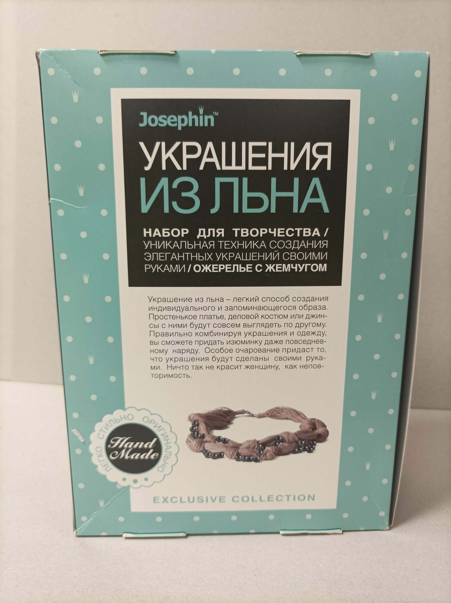В набор входит: нить льняная, бусины (имитация жемчуга), застежка-карабин, двойное колечко, нитковдеватель, клей, кисть, инструкция.