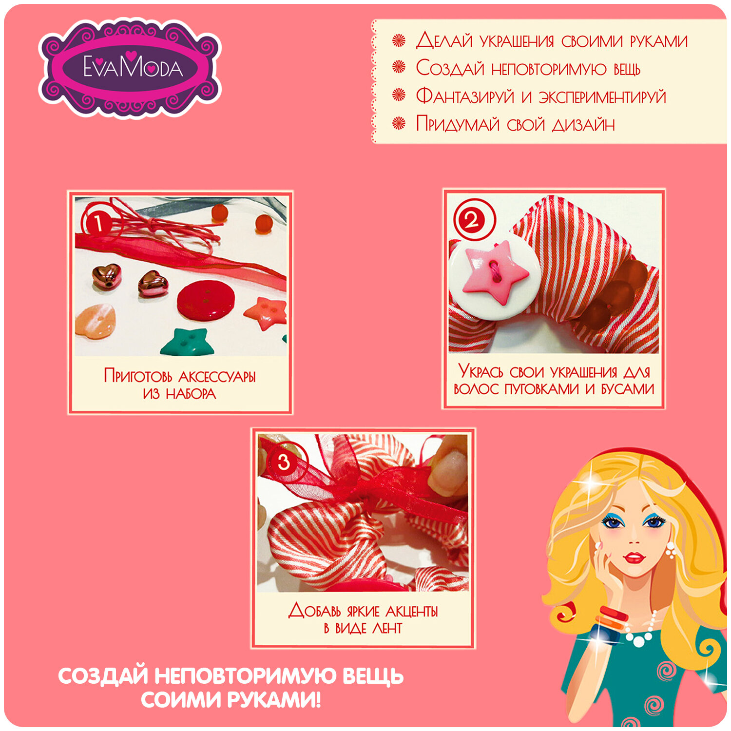 В наборе: 2 готовые декоративные резинки, бусы, пуговицы, лента, шнур, иллюстрированная инструкция.