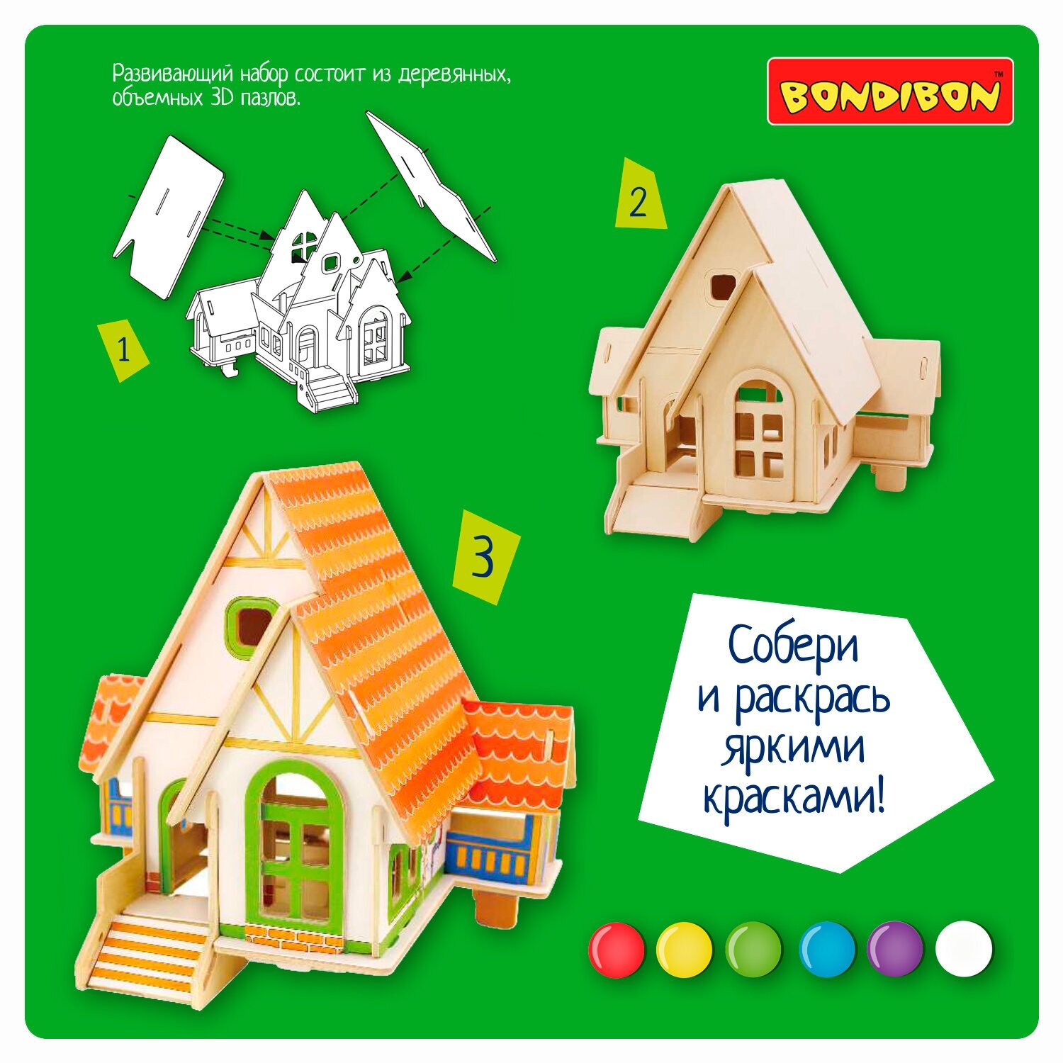 Чудесный деревянный домик-пазл ТМ BONDIBON. Собери и раскрась яркими красками Развивающий набор состоит из деревянных, объемных 3D пазлов. Способствует развитию творческого начала, мелкой моторики рук, усидчивости и пространственного мышления Размер домика в собранном виде 22,5х17,5х20,5 см.