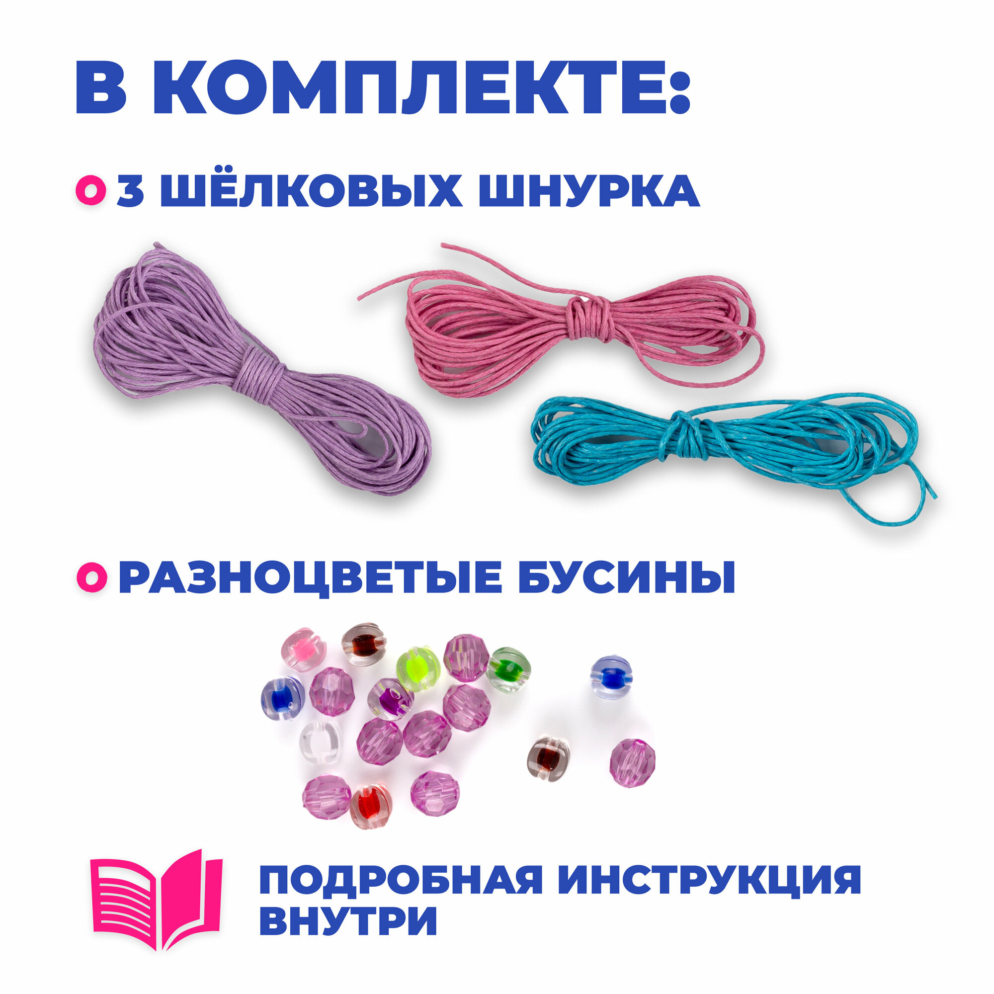 В комплекте: 3 разноцветных декоративных шнурка, 18 разноцветных бусин, инструкция.