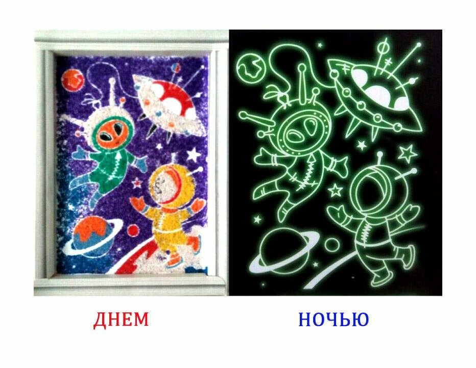 В набор входит: трехслойная основа с высечным трафаретом, набор цветного песка, люминофор, заготовка рамки, деревянный стик, кисточка, бумажная салфетка, подробная инструкция.
