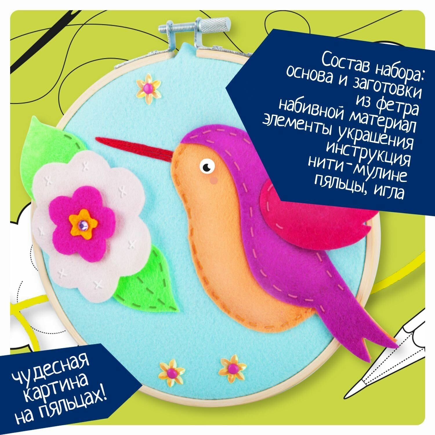 Состав набора: основа и заготовки из фетра, набивной материал, элементы украшения, нити-мулине, пяльцы, игла, инструкция.