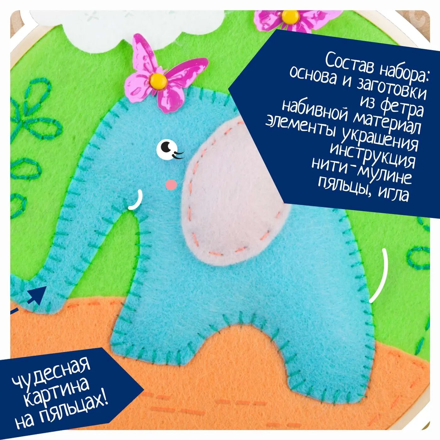 Состав набора: основа и заготовки из фетра, набивной материал, элементы украшения, нити-мулине, пяльцы, игла, инструкция.