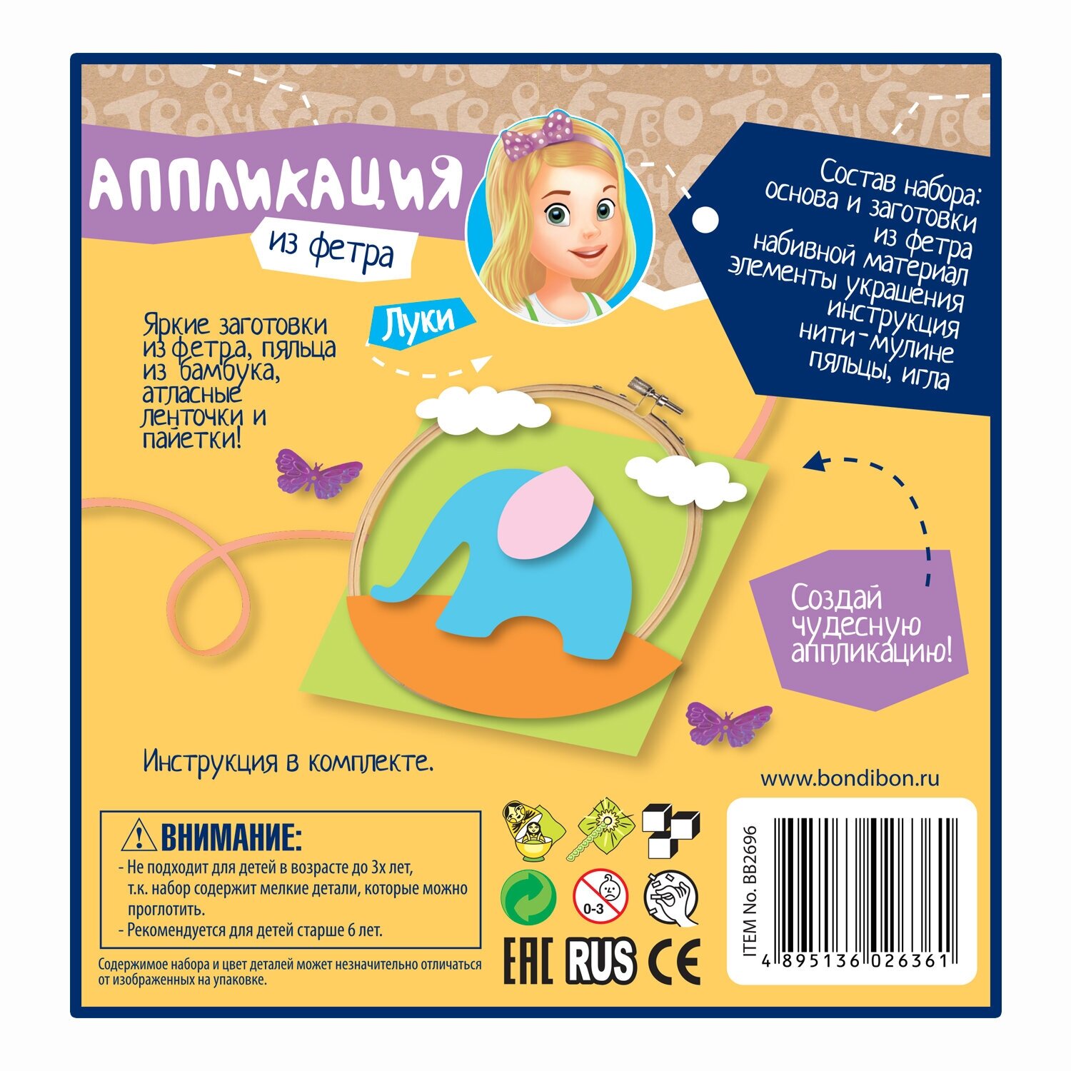 Набор "Аппликация из фетра. Слоник на прогулке" (ВВ2696); BONDIBON, 2018