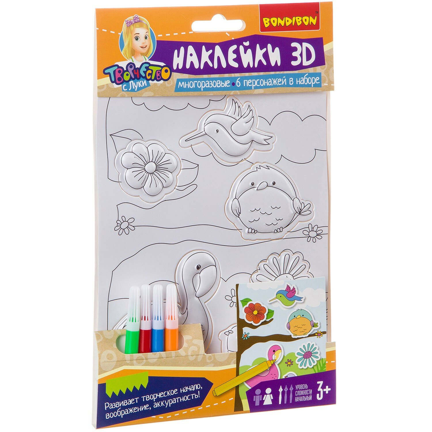 В наборе: 6 3D наклеек, фломастеры (4 цвета).