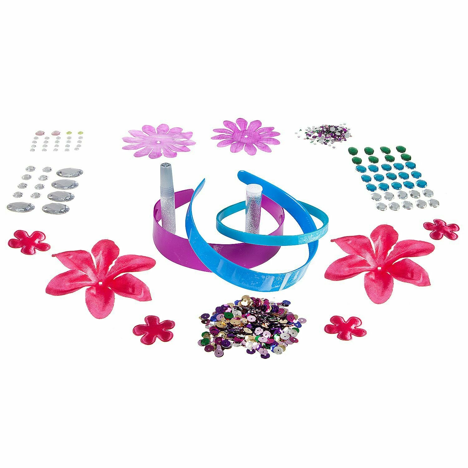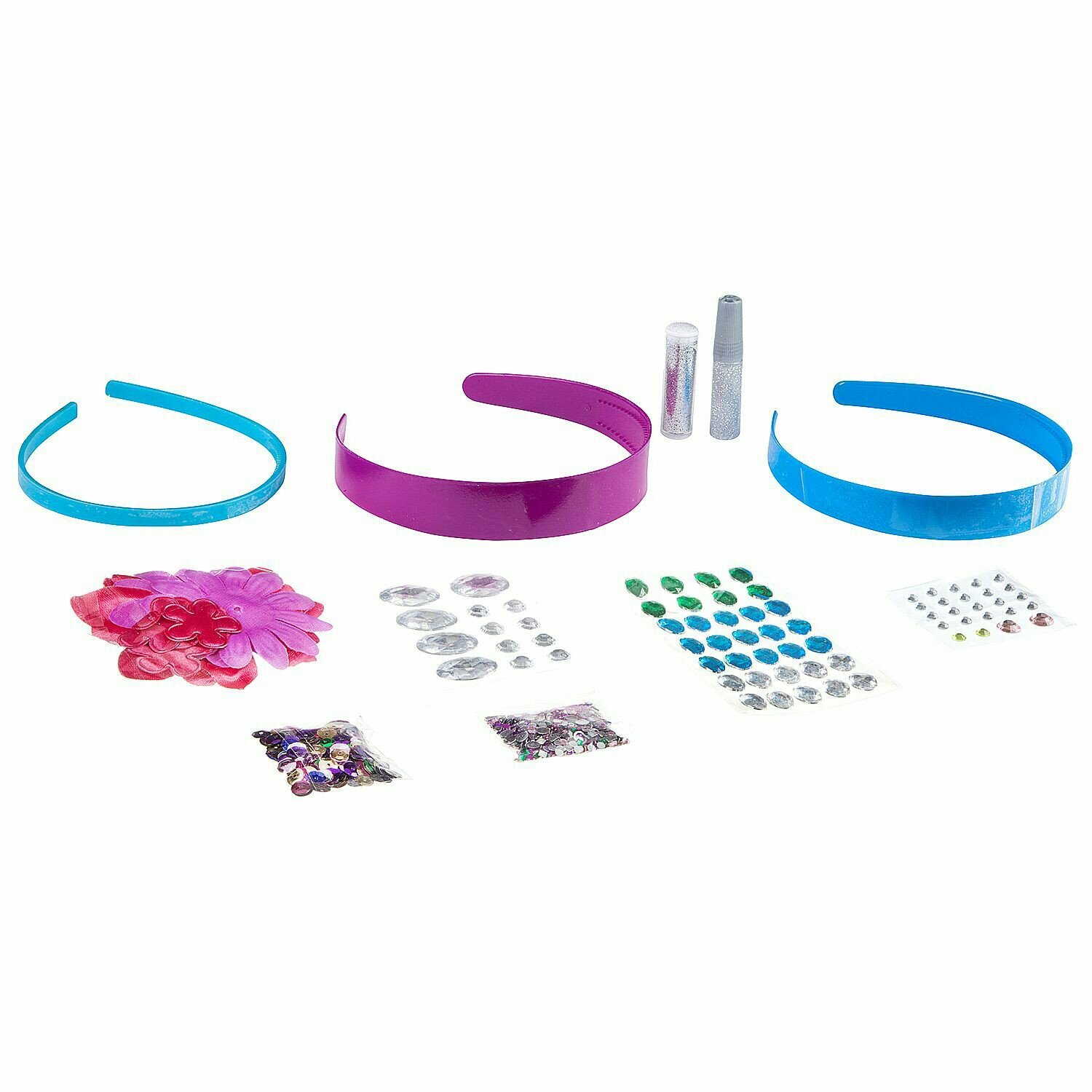 В наборе для творчества: 3 заготовки для ободков из пластика, 8 цветов из ткани, стразы в ассортименте, пайетки в ассортименте, блестки в тубике, клей с блестками, инструкция.