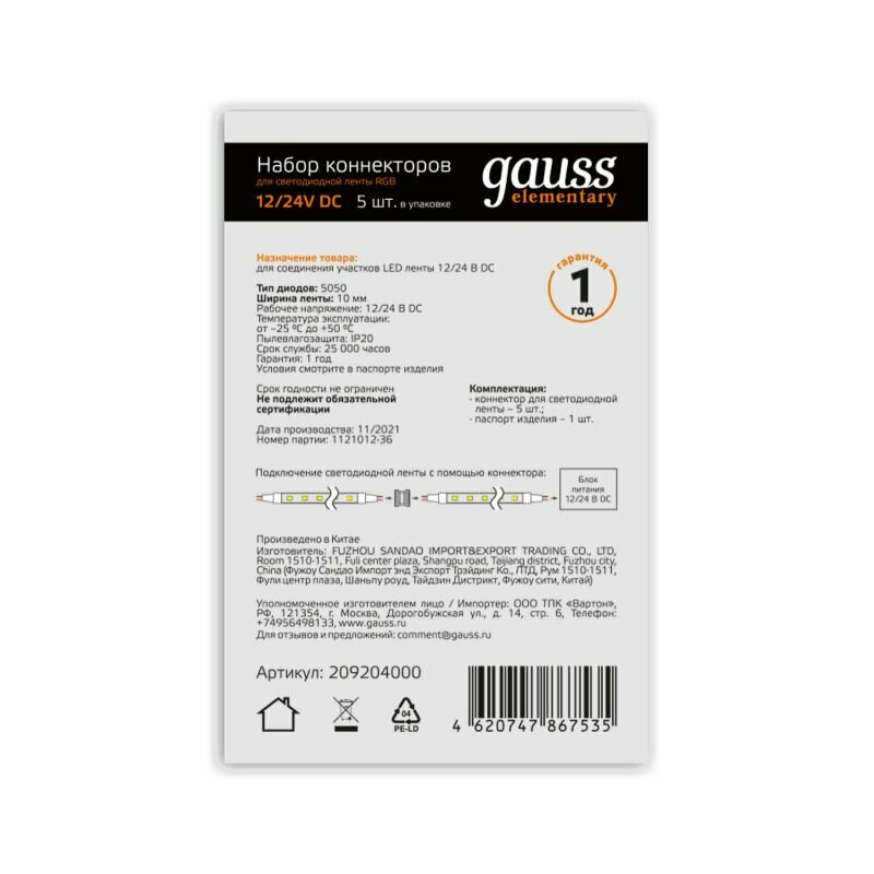 Светодиодая лента и комплектующие Gauss . Подчеркнет стиль помещения. Параметры пылевлагозащиты IP — 20. Страна происхождения бренда — РОССИЯ.