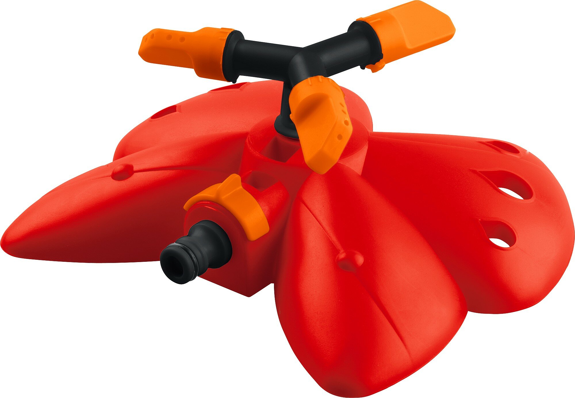 Распылитель Grinda используется для стационарного полива растений. Выполнен в форме бабочки. Устойчивую фиксацию в почве обеспечивает пластиковая пика. Для удобного хранения она может быть закреплена внутри распылителя. Регулировка дальности полива обеспечивается путем поворота одного из 3 сопл распылителя. Корпус изготовлен из ударопрочного пластика. К шлангу подключается при помощи соединителя. Высококачественный материал является гарантией надежности, устойчивости к влаге и высокому давлению.