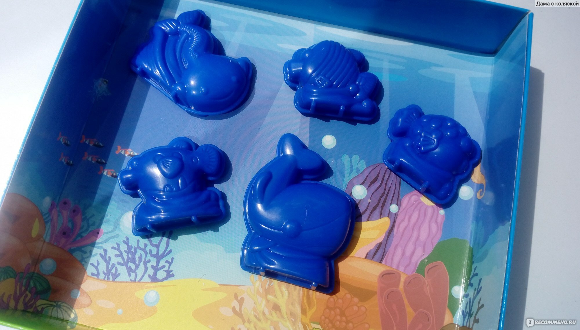 - в наборе: коробка с рисунком "Морское дно" для игры, песок натурального цвета (300 гр.), 5 формочек, инструкция.