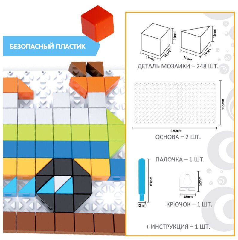 В комплект входит: деталь мозаики (248 шт.), основа (2 штуки, соединяются между собой), крючок (1 шт.), палочка (1 шт.), инструкция.