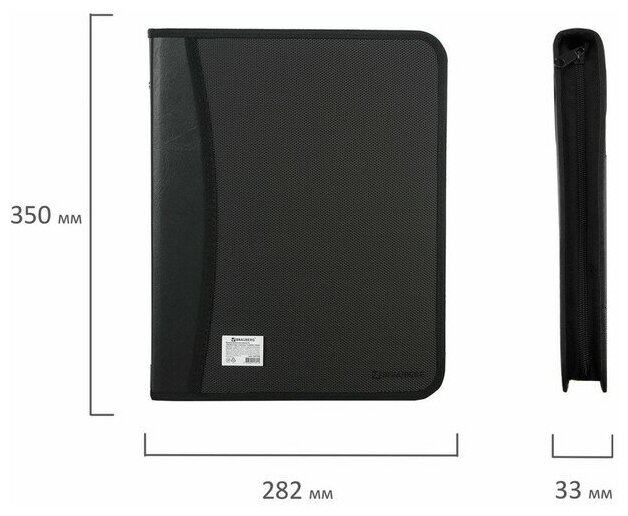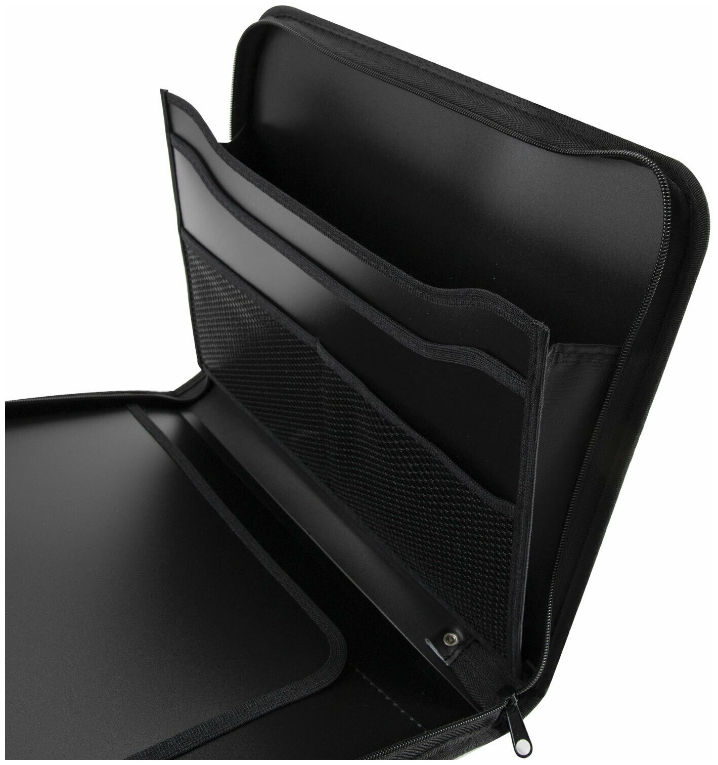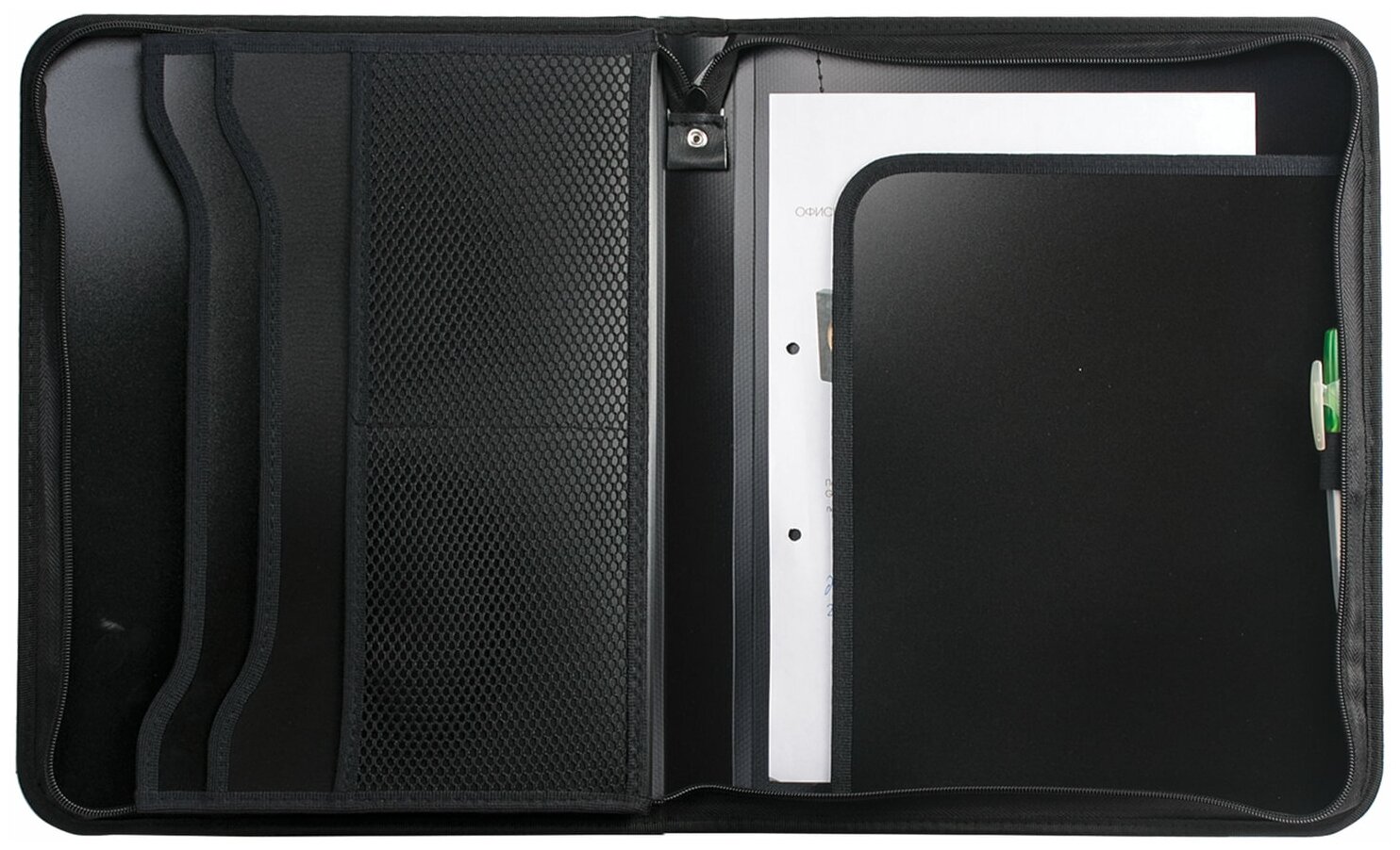 Папка формата А4 закрывается на молнию, имеет два внутренних отделения и четыре кармана. Изготовлена из прочного пластика черного цвета. Папка удобна для переноски документов, предотвращает их смятие и загрязнение.