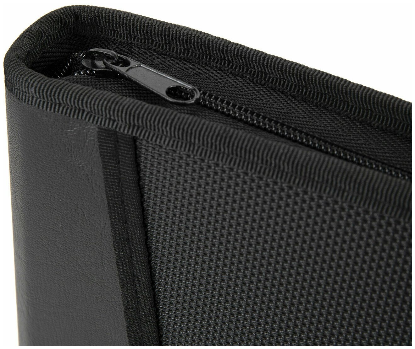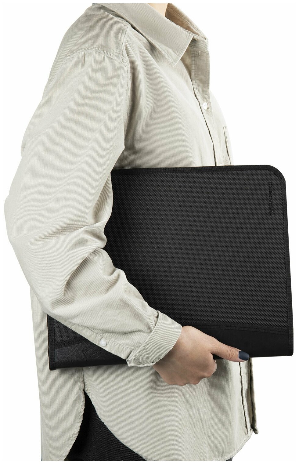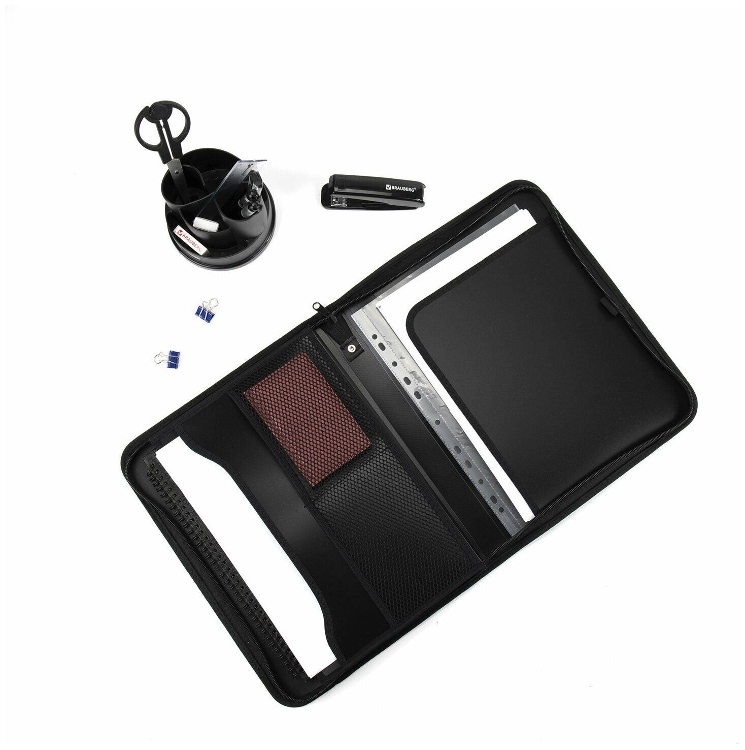 Папка формата А4 закрывается на молнию, имеет два внутренних отделения и четыре кармана. Изготовлена из прочного пластика черного цвета. Папка удобна для переноски документов, предотвращает их смятие и загрязнение.