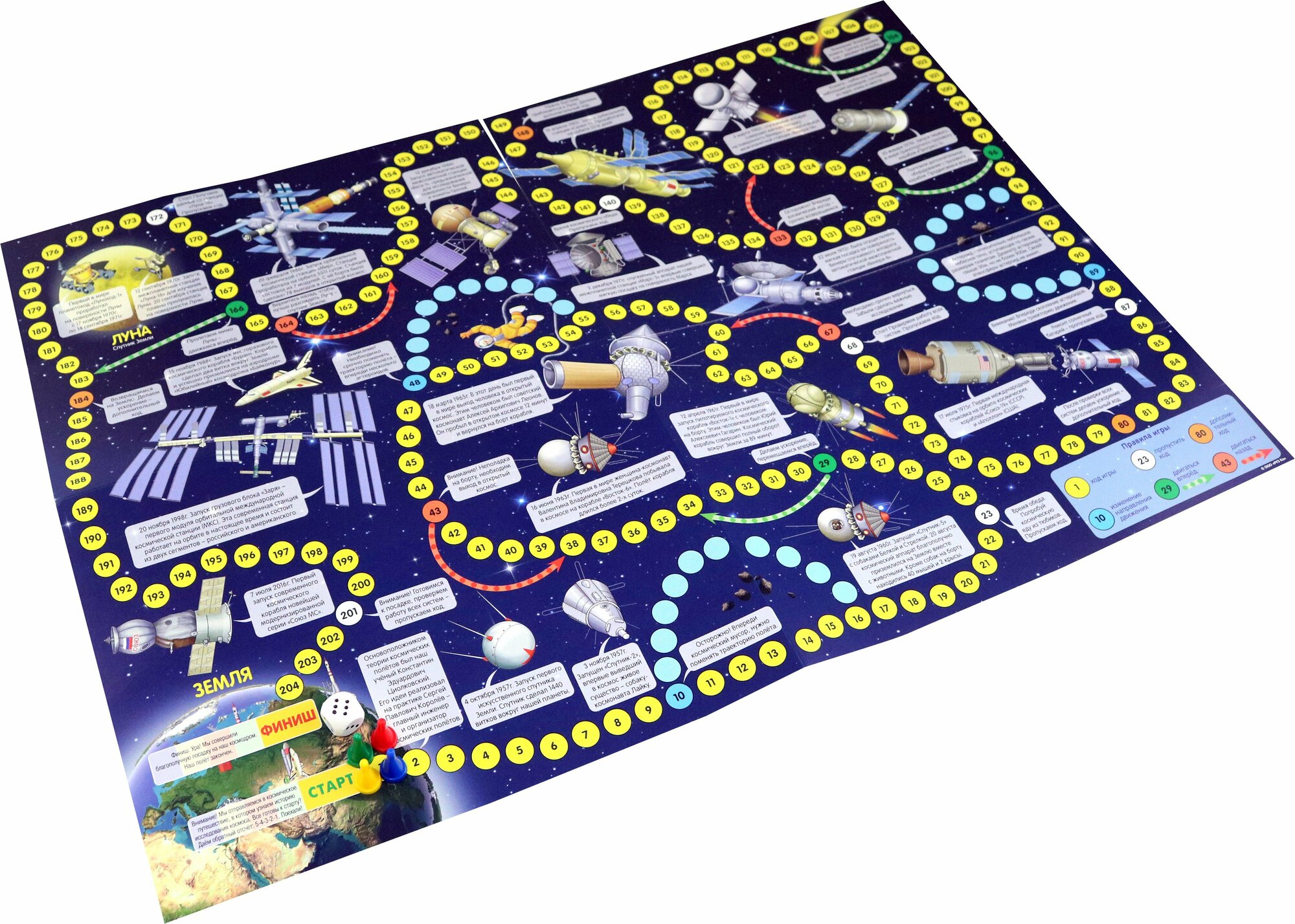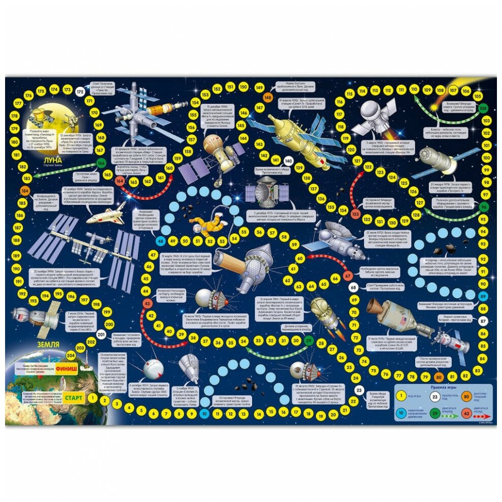 Космическое путешествие. Настольная игра из серии `Играем всей семьей`. Традиционные настольные игры из серии `Играем всей семьей` с кубиком и фишками направлены на познание мира и развитие эмоций, умения ребёнка общаться и играть по правилам. С захватывающими и интересными играми ребята и их родители весело проведут своё свободное время, совершив увлекательные путешествия.Играть могут четверо. Фишки ставят на старт и определяют первенство хода. Бросив кубик, игроки делают столько ходов по игровому полю, сколько очков выпало на кубике. Выиграет тот, кто первым доберётся до финиша.В комплекте: игровое поле, 4 фишки, кубик. Размер игрового поля: 59х42 см. Возраст: от 3-х лет. Материалы: картон, пластмасса. Не рекомендуется детям до 3-х лет. Содержит мелкие детали. Сделано в России.